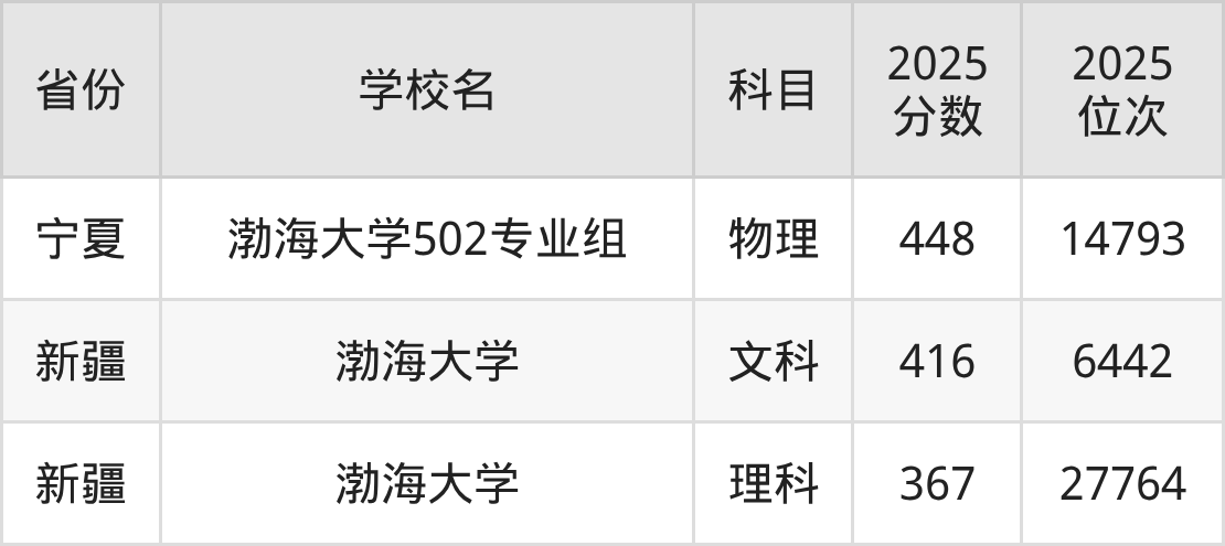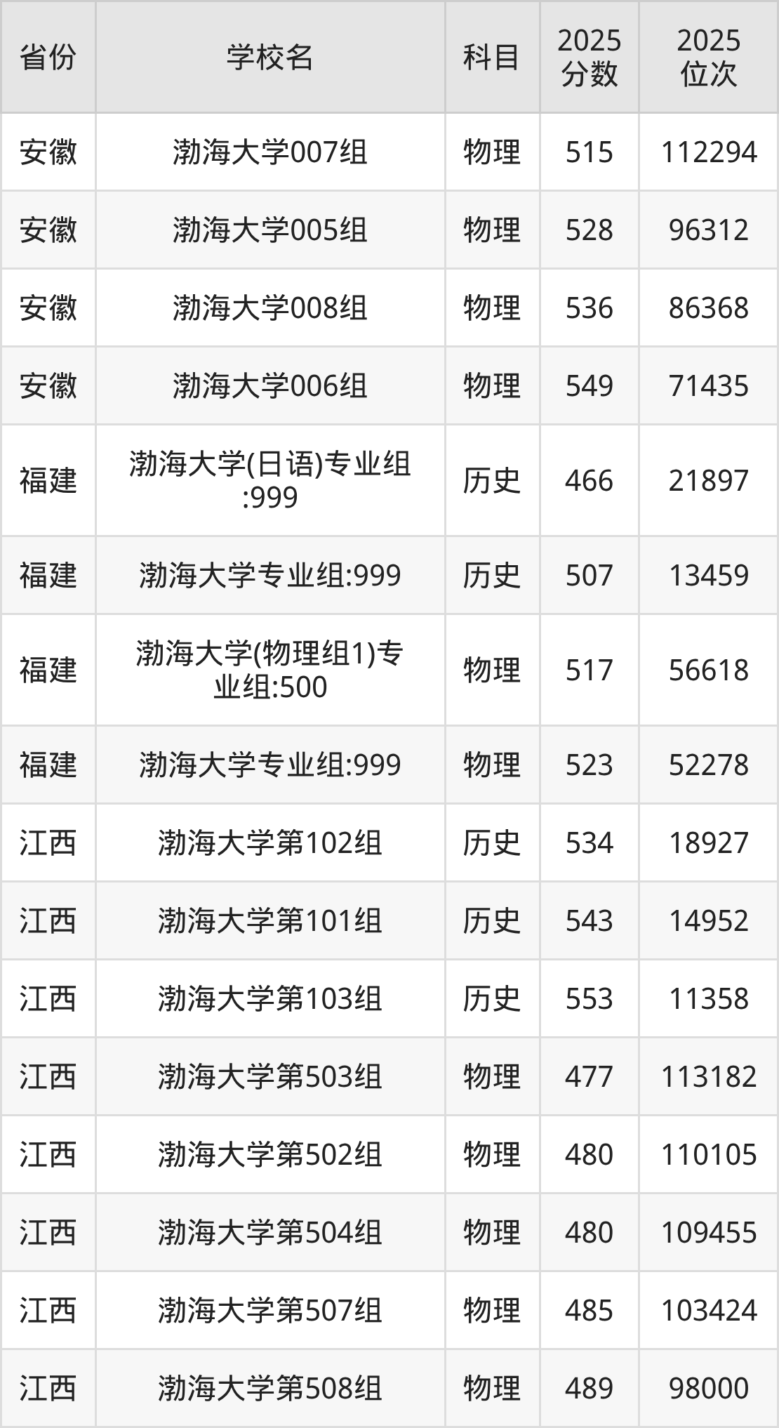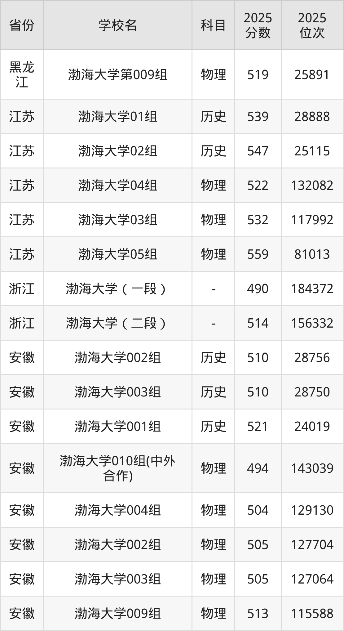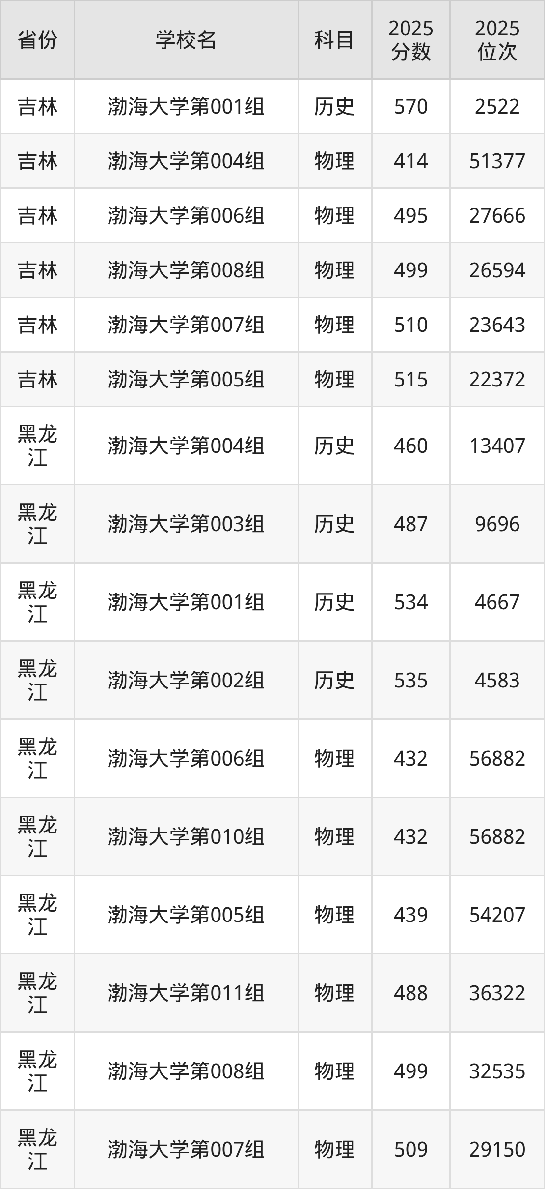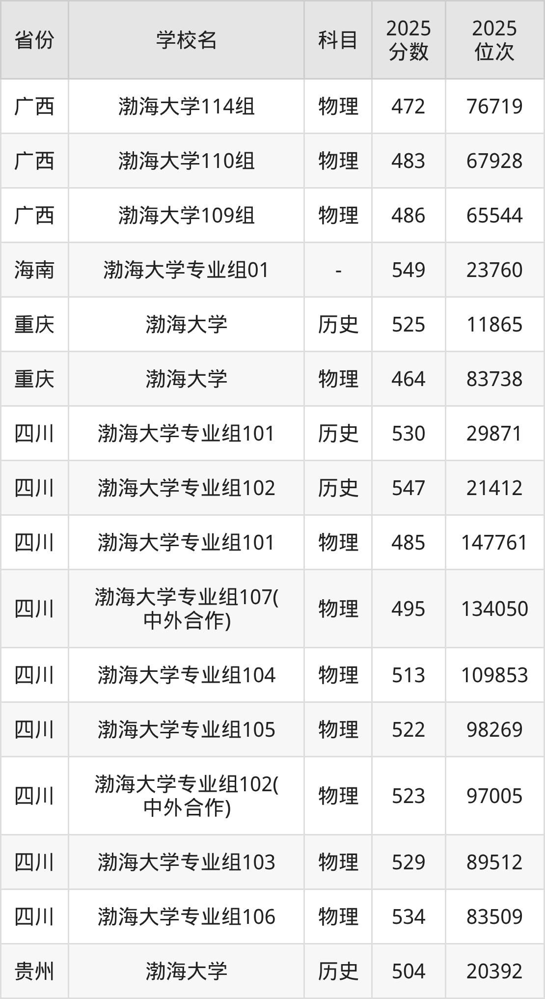 2025年渤海大学历史类最低分476分(19290名)、物理类最低分456分(78788名)。