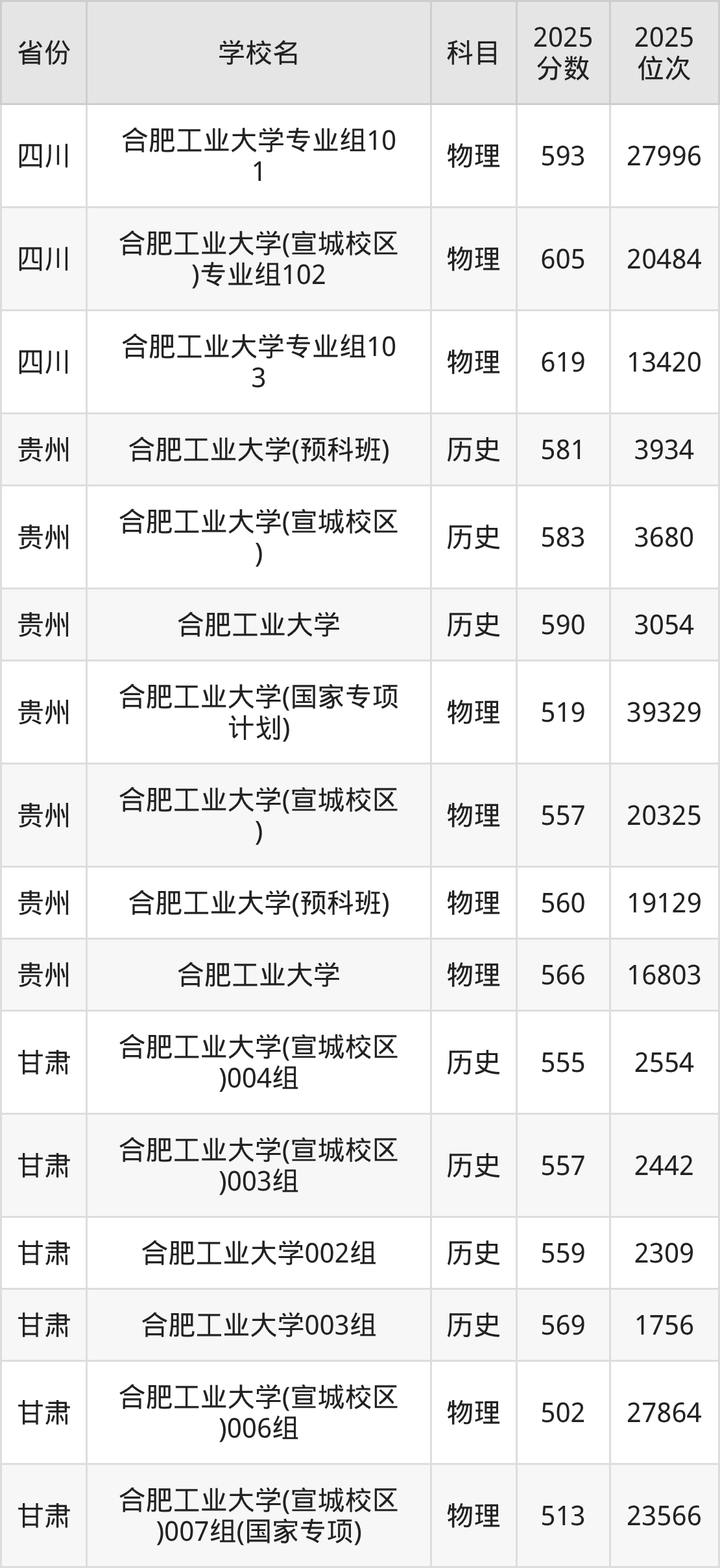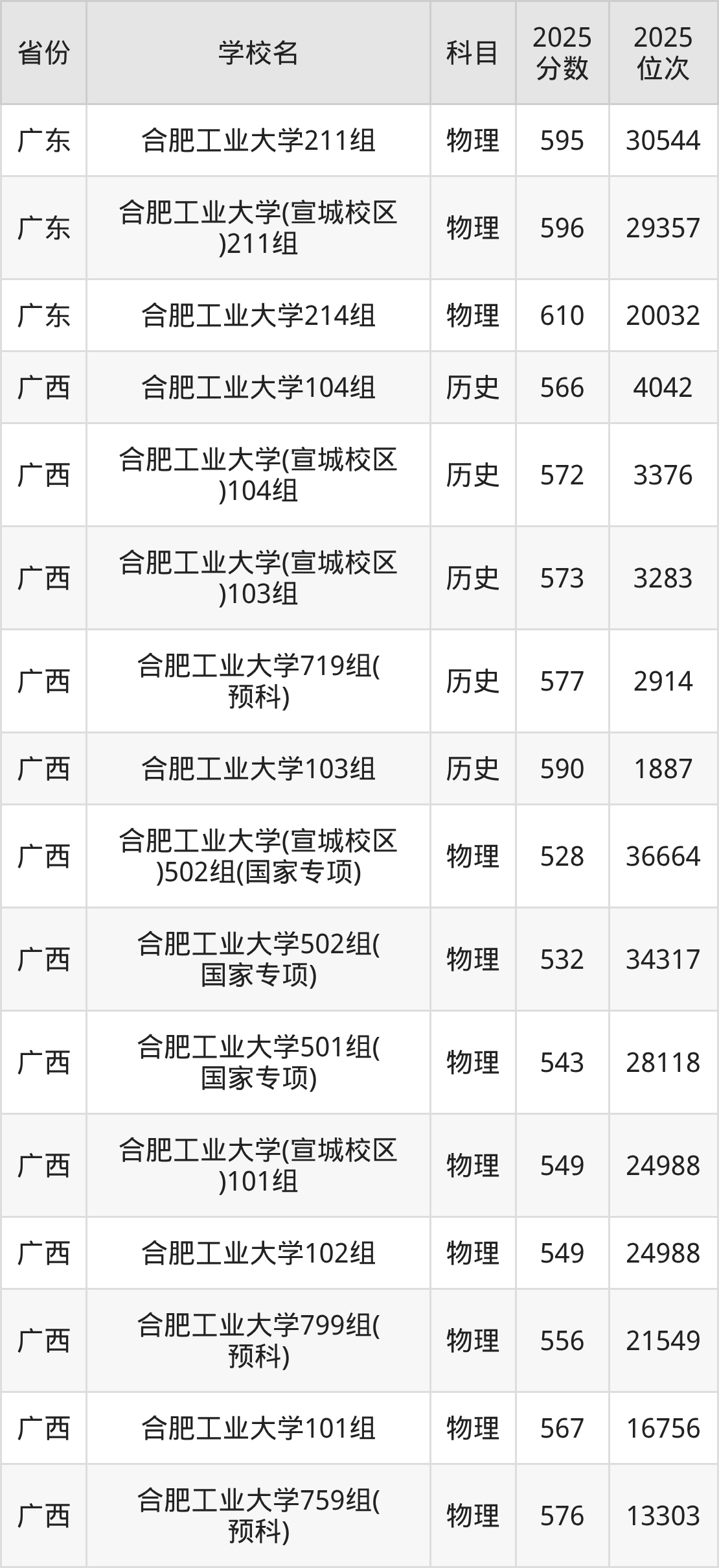 2025年合肥工业大学在省内,其中历史类最低分是587分、对应位次是5225名;物理类最低分是592分,对应位次是32176名。
