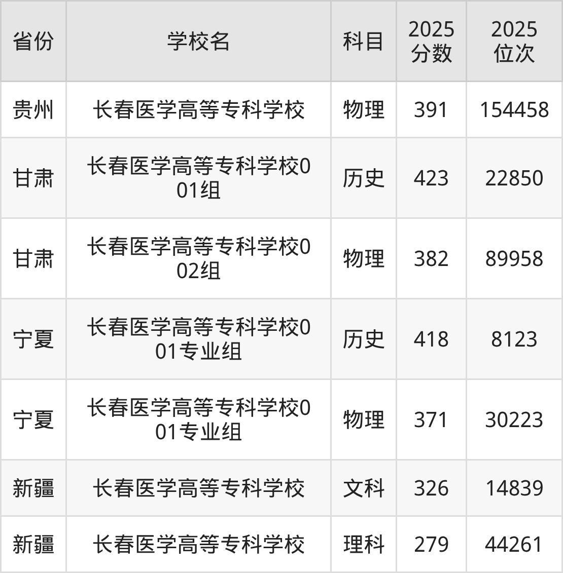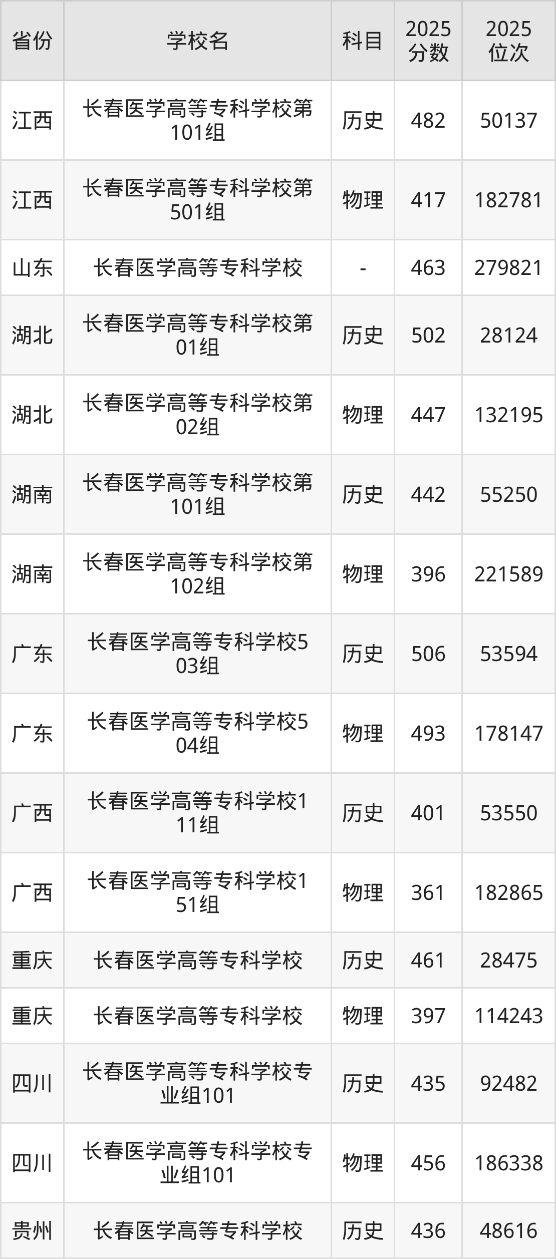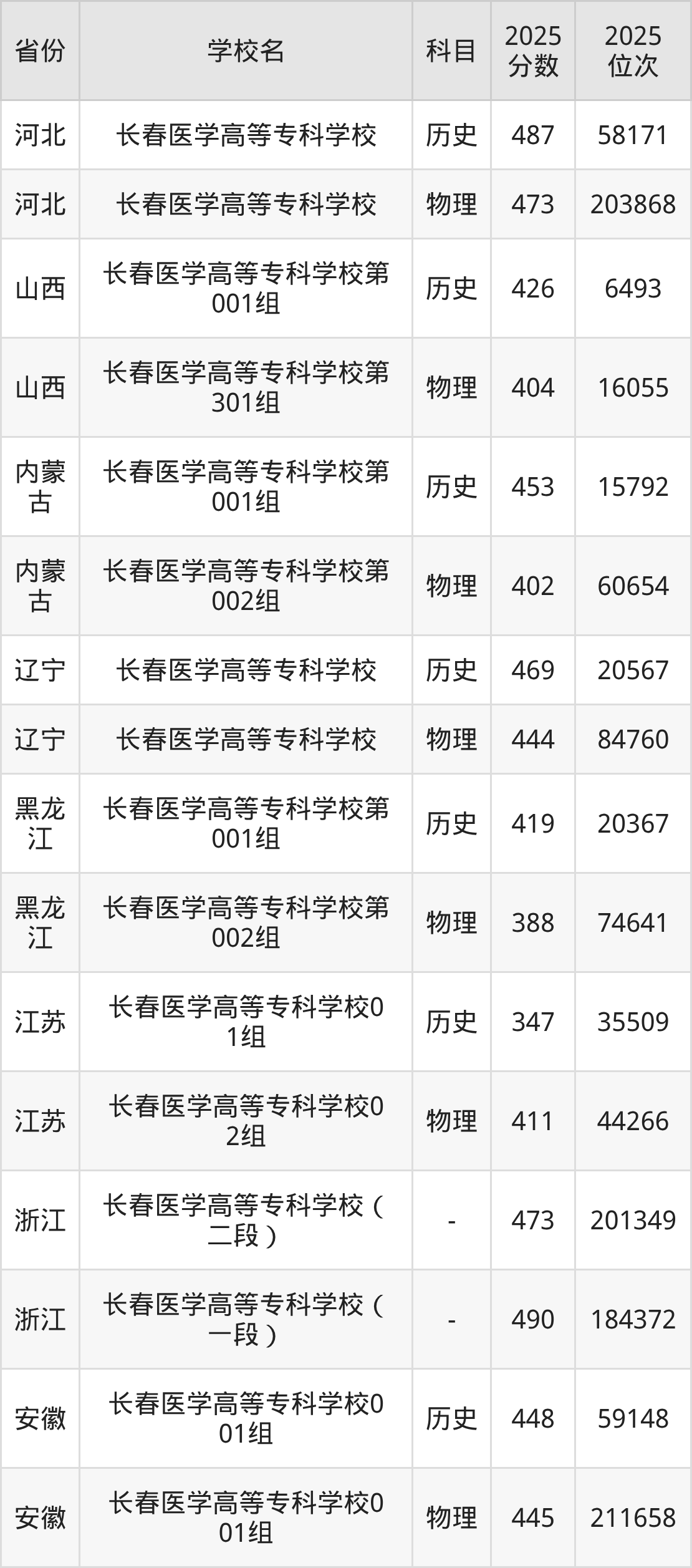 2025年长春医学高等专科学校历史类最低分371分(22886名)、物理类最低分234分(78432名)。