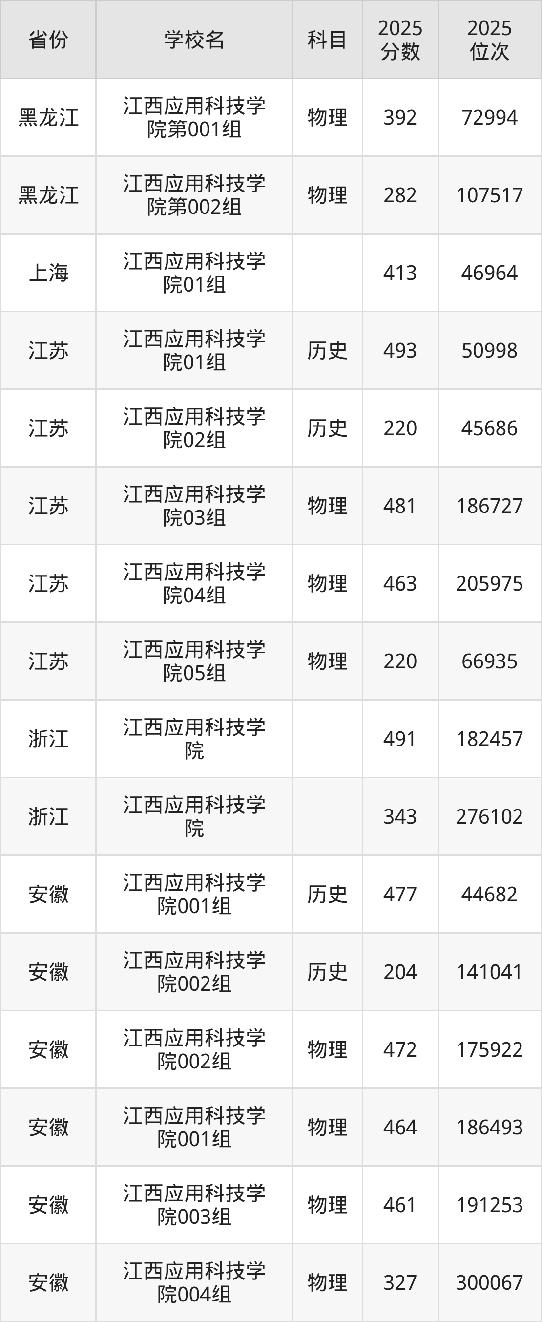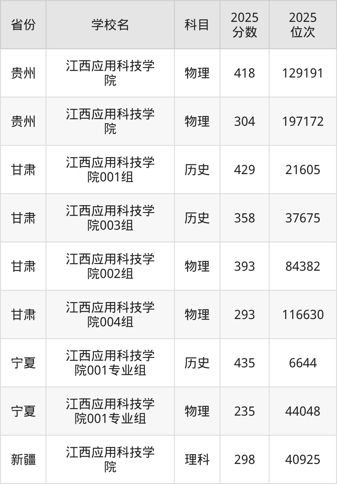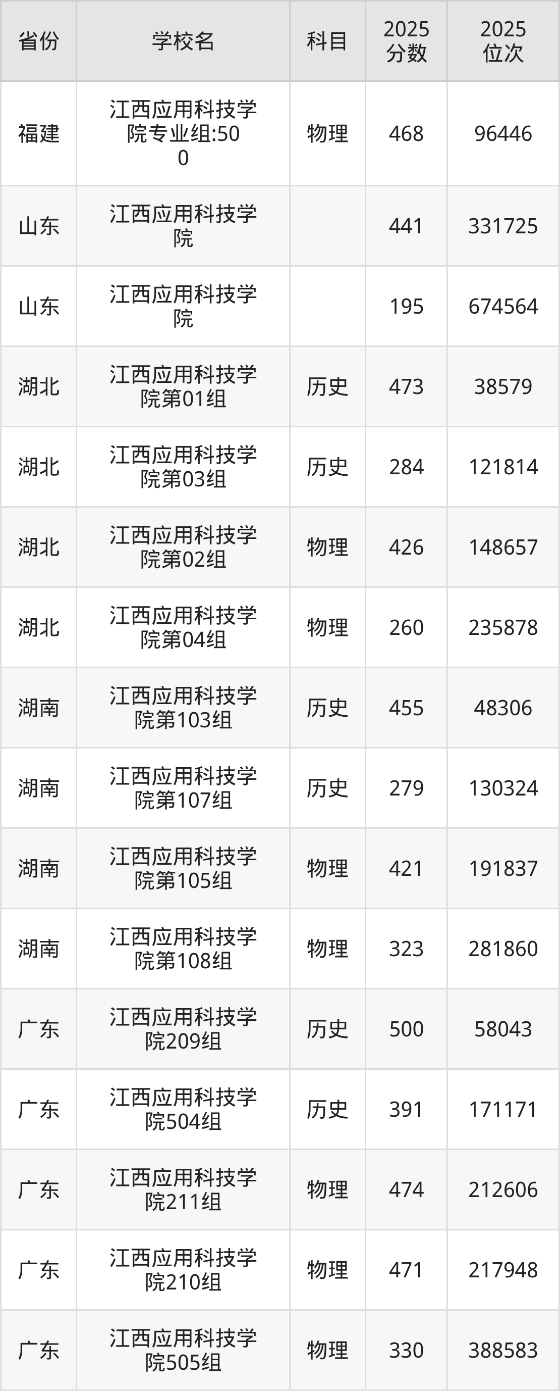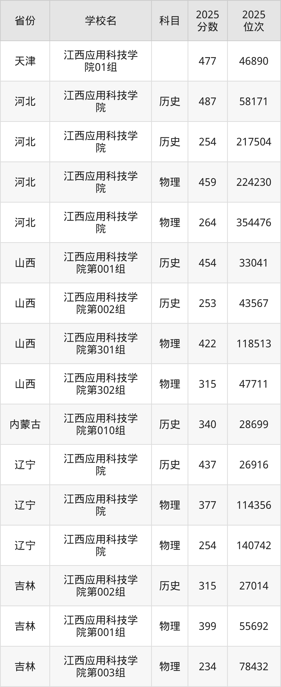 2025年江西应用科技学院在省内分历史物理科目类录取,其中历史类最低分是424分、对应位次是87358名;物理类最低分是354分,对应位次是225008名。