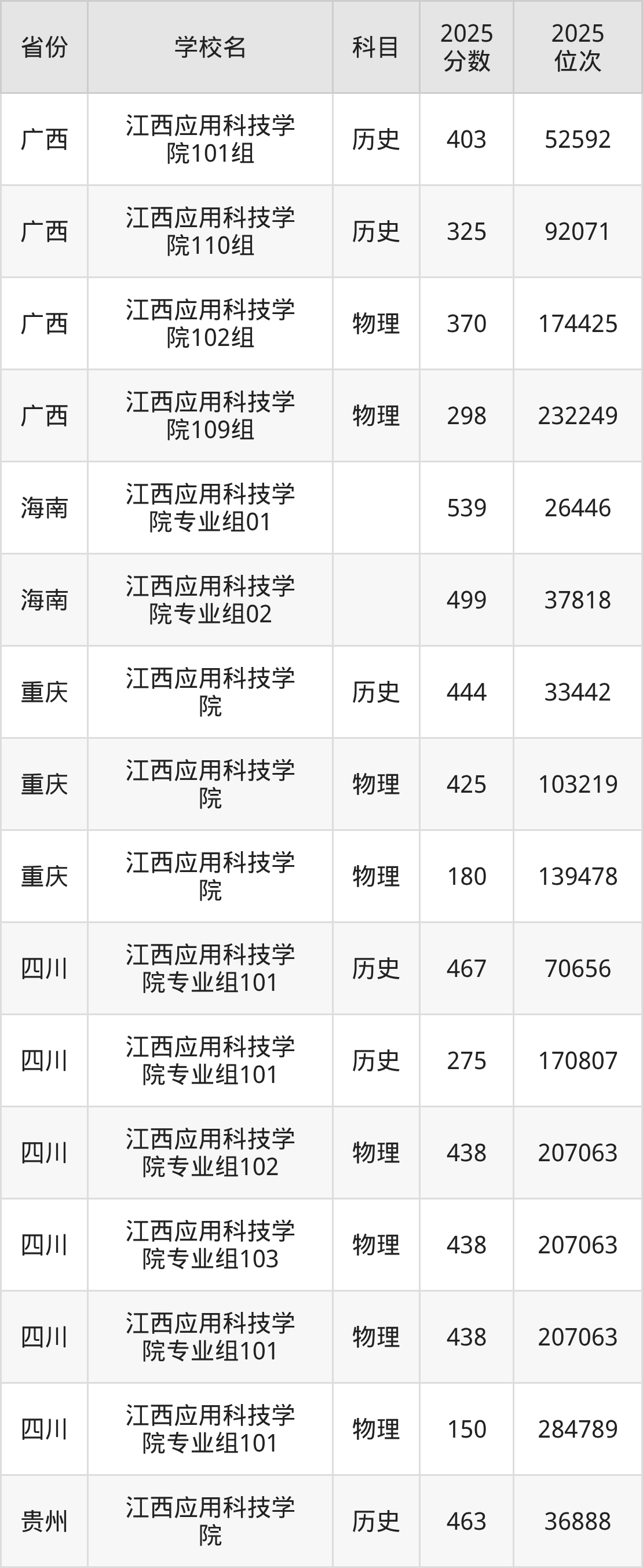 2025年江西应用科技学院在省外录取分数线范围整体位于150分到539分之间,录取分数线最低在四川物理(专业组101)、录取分数线最高在海南(专业组01)。