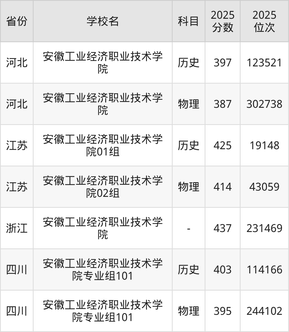 2025年安徽工业经济职业技术学院历史类最低分421分(73718名)、物理类最低分411分(247933名)。