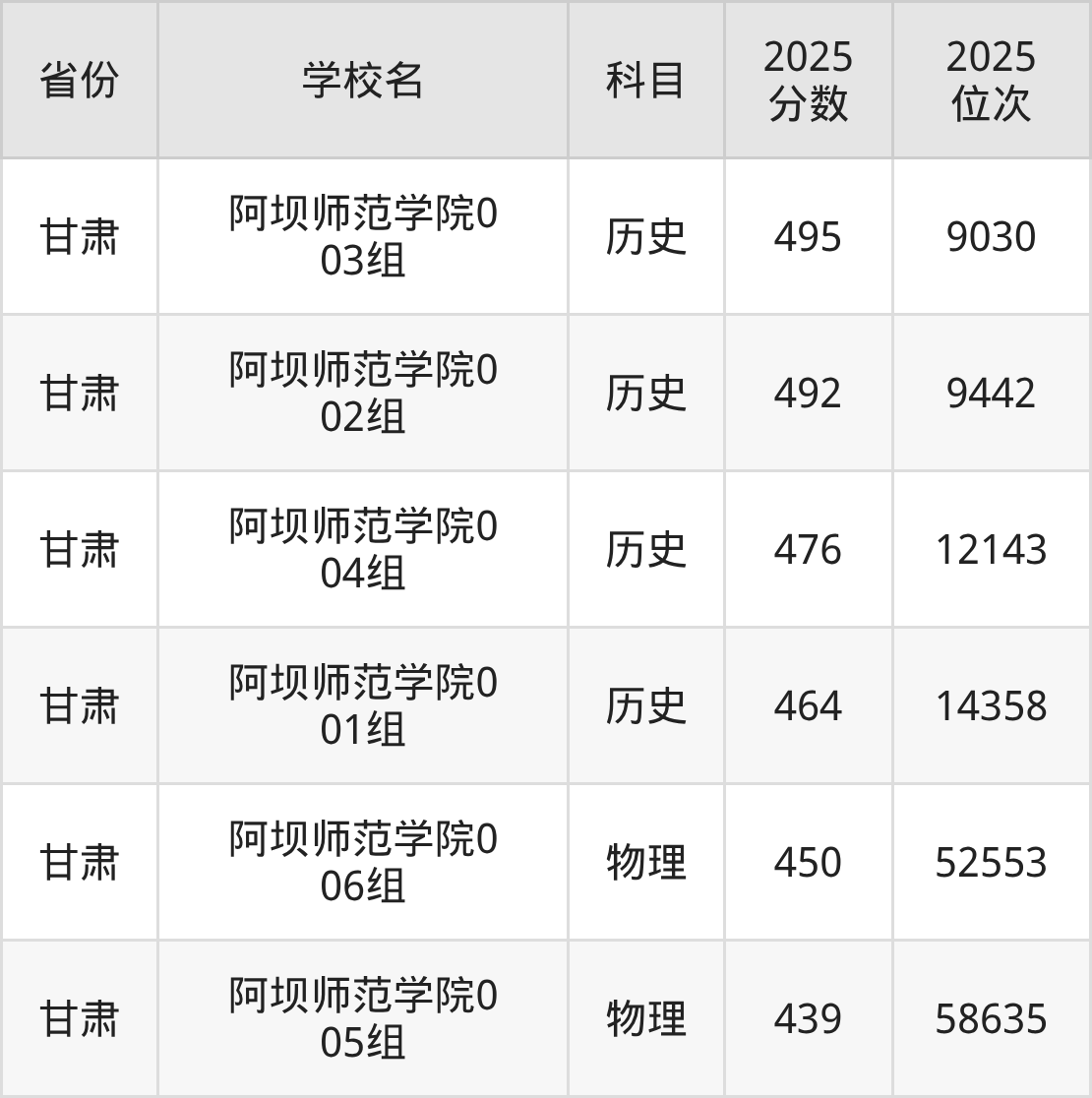 2025年阿坝师范学院在省内分历史物理科目类录取,其中历史类最低分是524分、对应位次是33264名;物理类最低分是492分,对应位次是138221名。