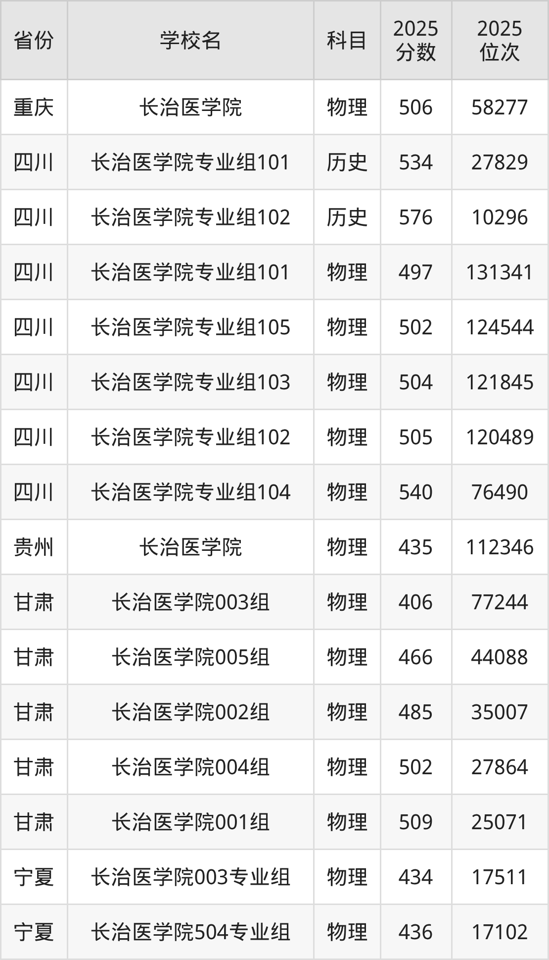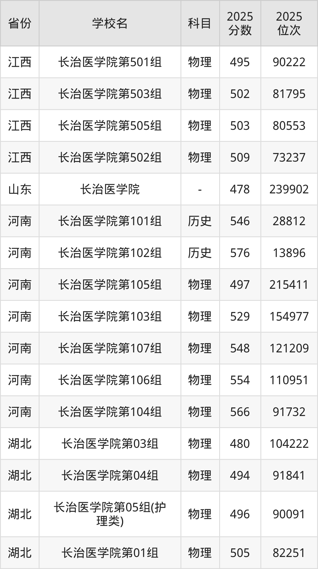 | 长治医学院第3 11组(国家专 项) | 物理 | 477 | 77883 |