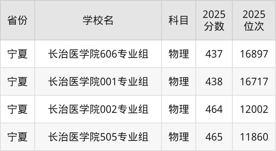 2025年长治医学院在省内,其中历史类最低分是492分、对应位次是22562名;物理类最低分是466分,对应位次是86533名。