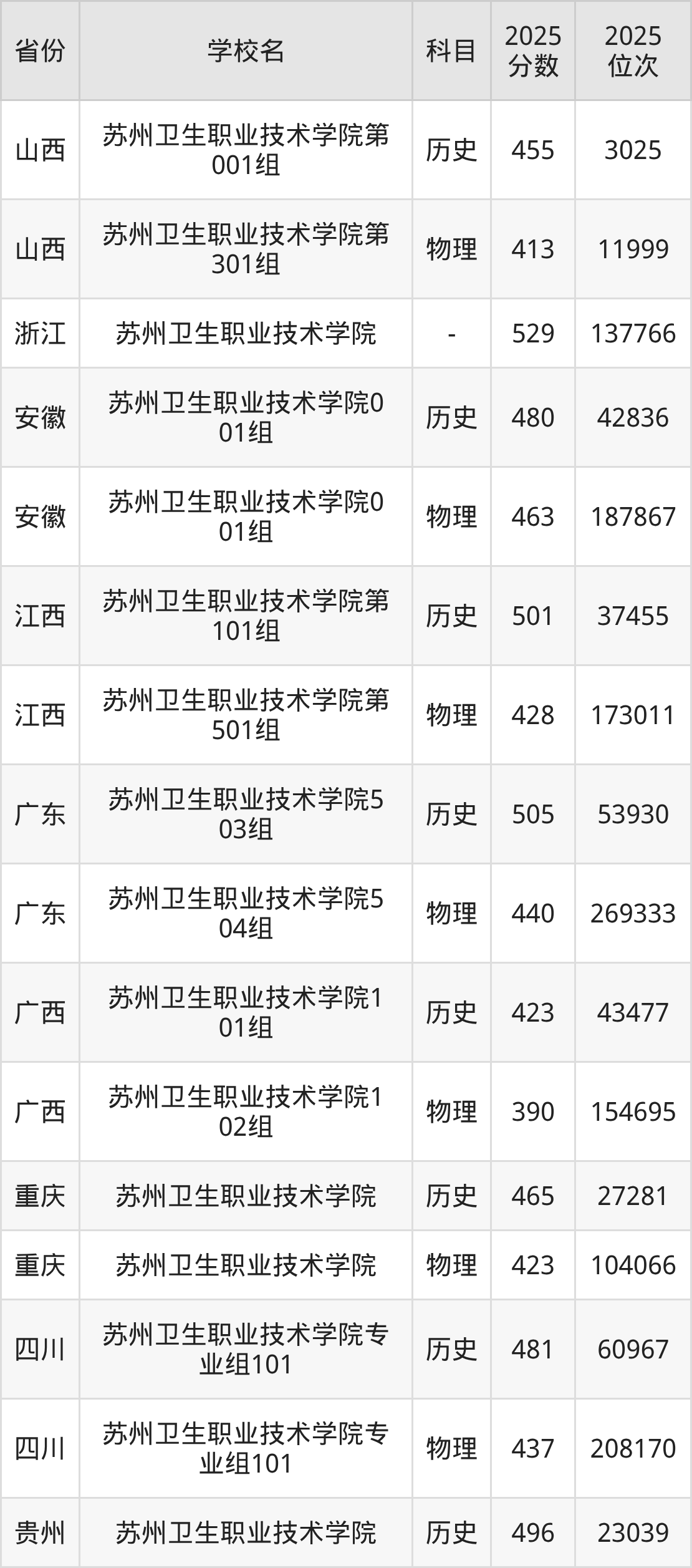 2025年苏州卫生职业技术学院历史类最低分466分(9758名)、物理类最低分220分(66935名)。
