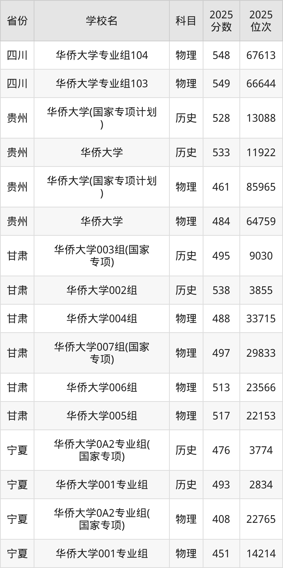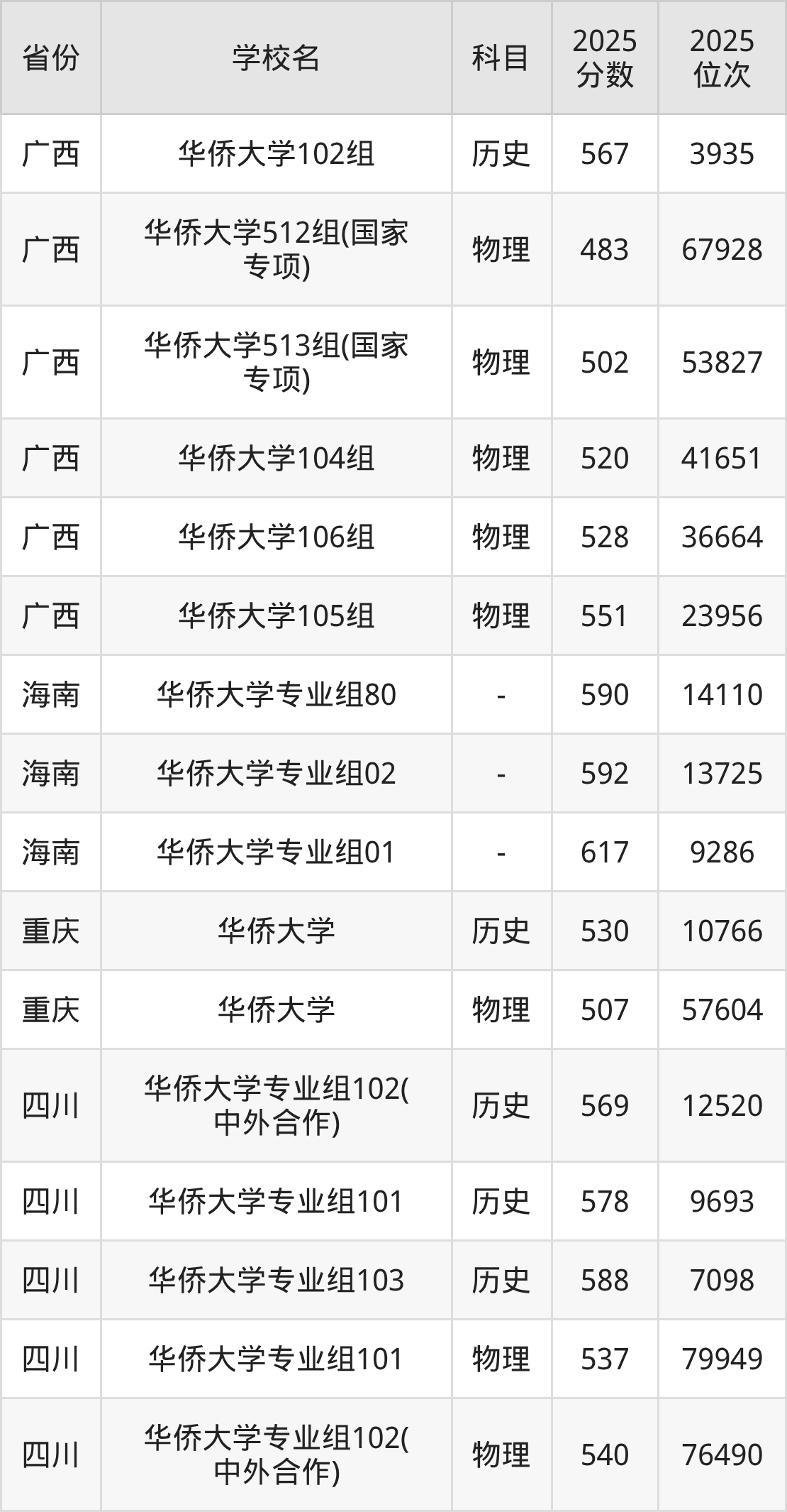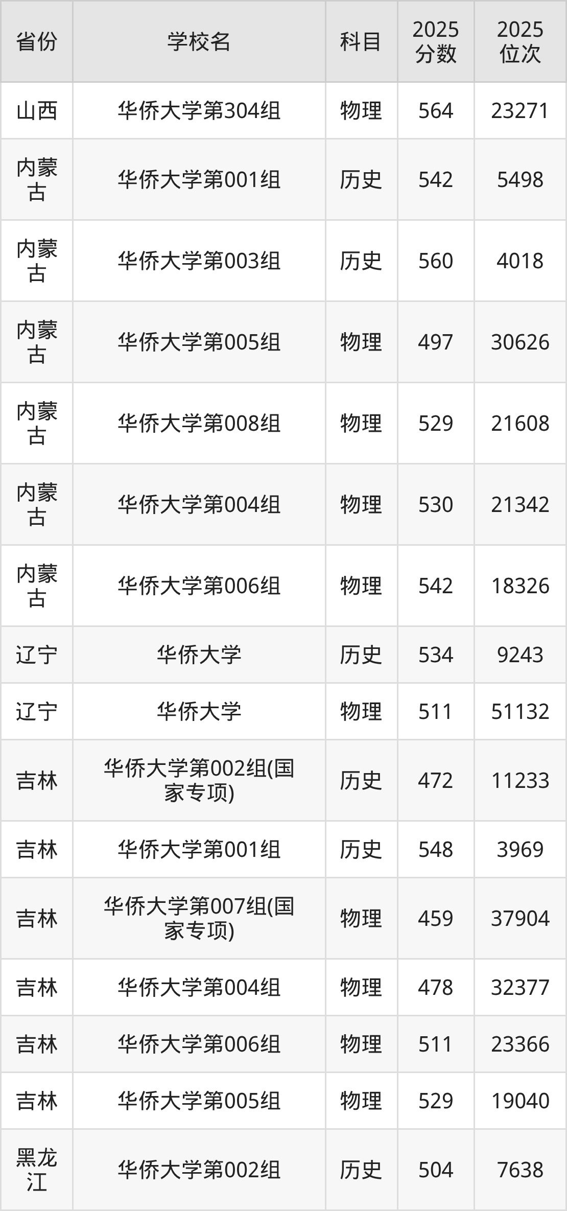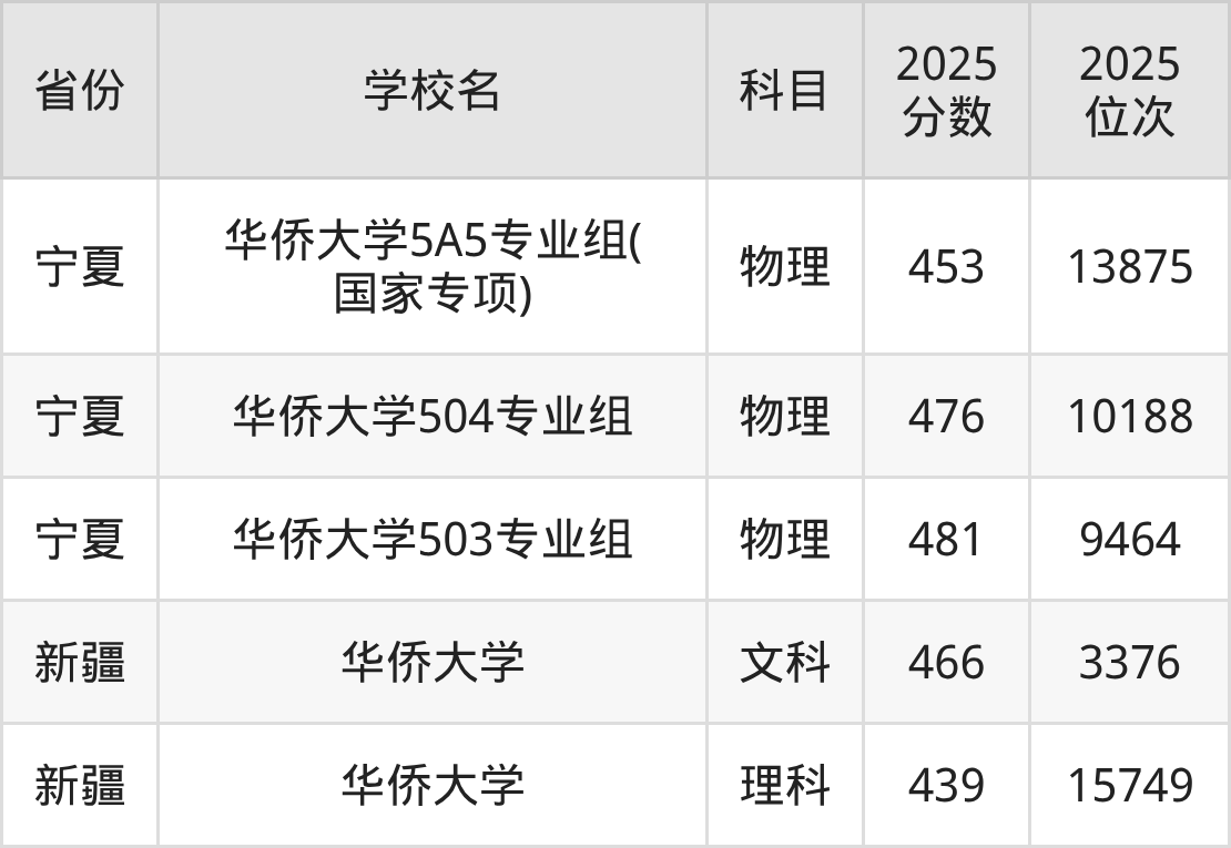 2025年华侨大学历史类最低分481分(18606名)、物理类最低分527分(49465名)。