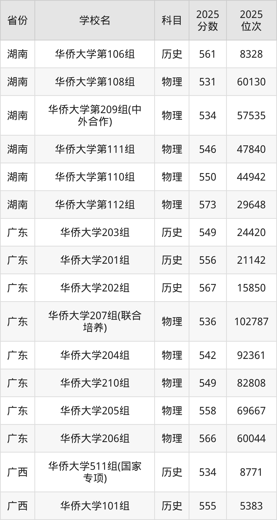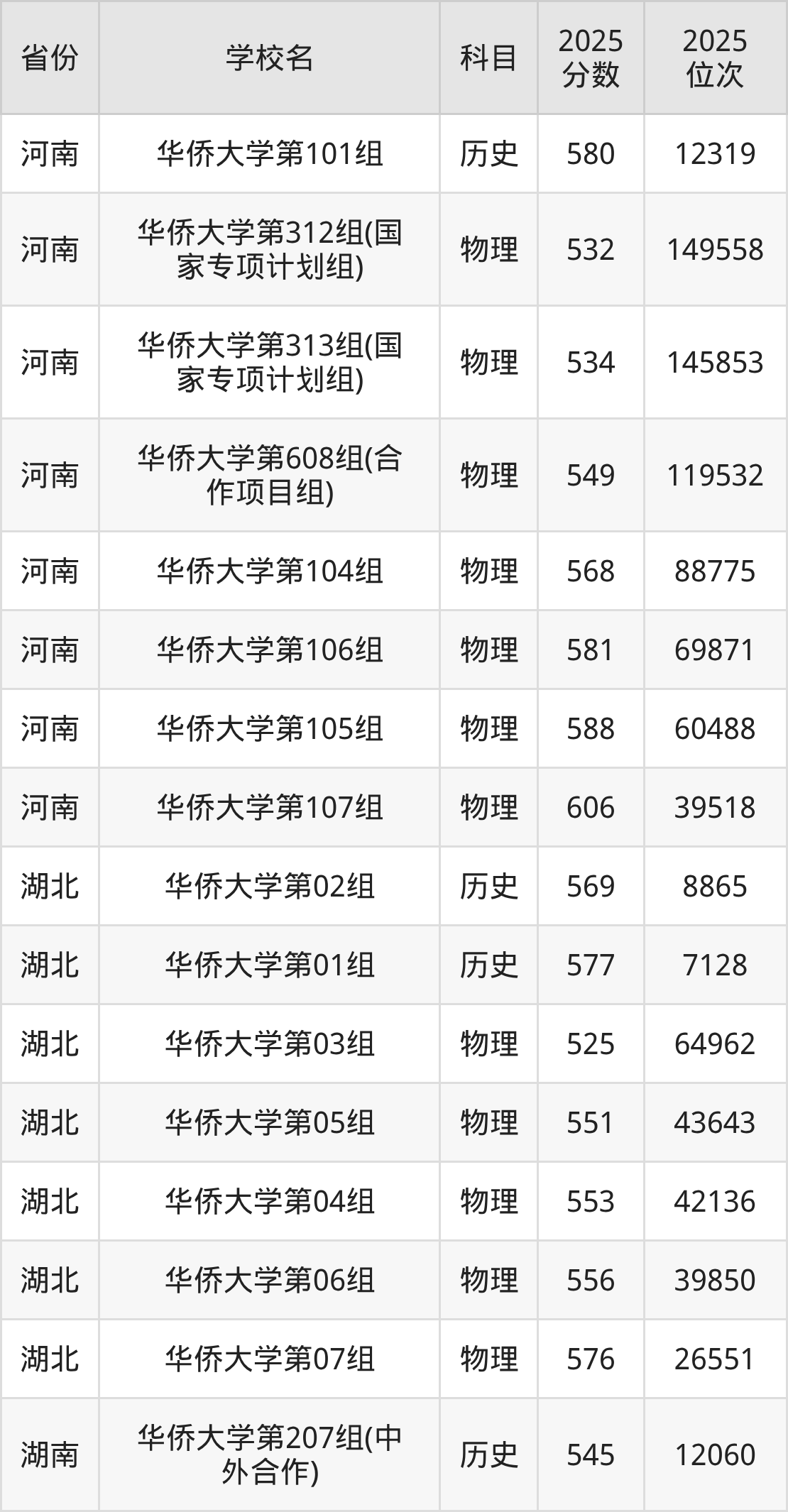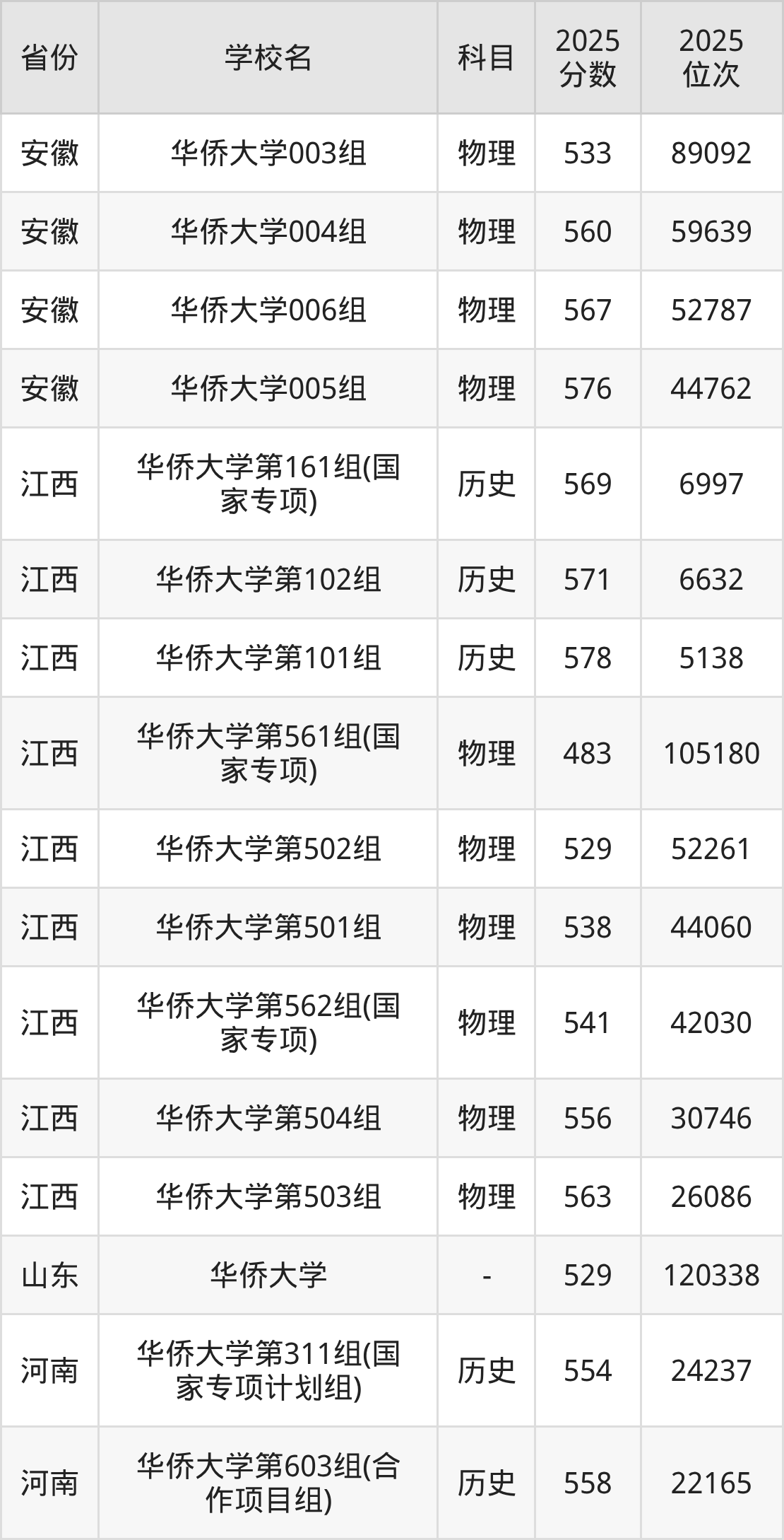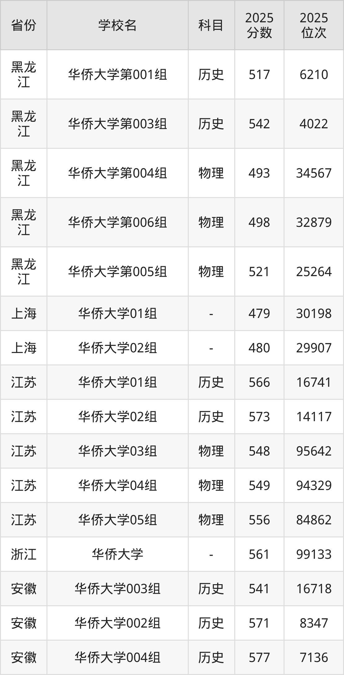 2025年华侨大学历史类最低分481分(18606名)、物理类最低分527分(49465名)。