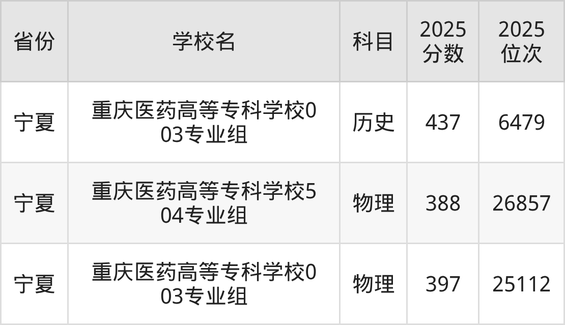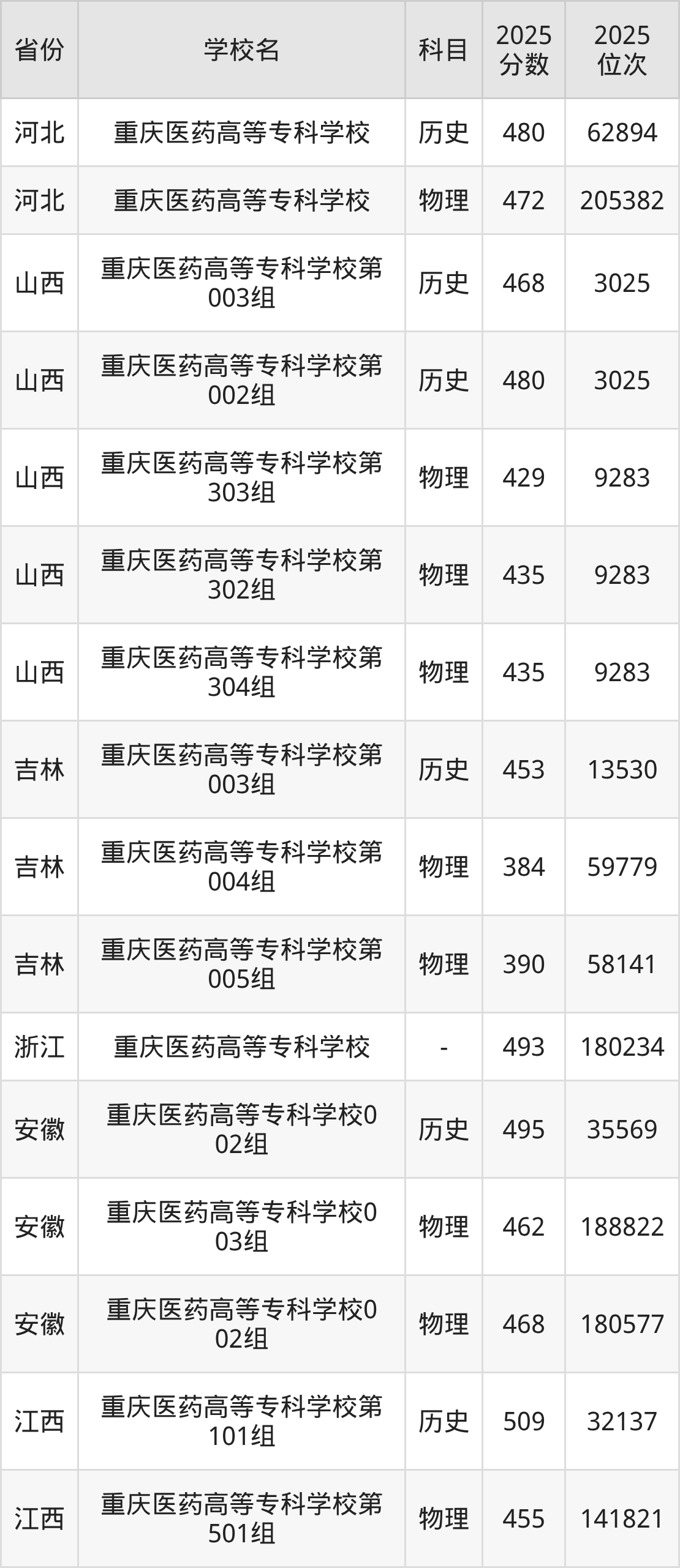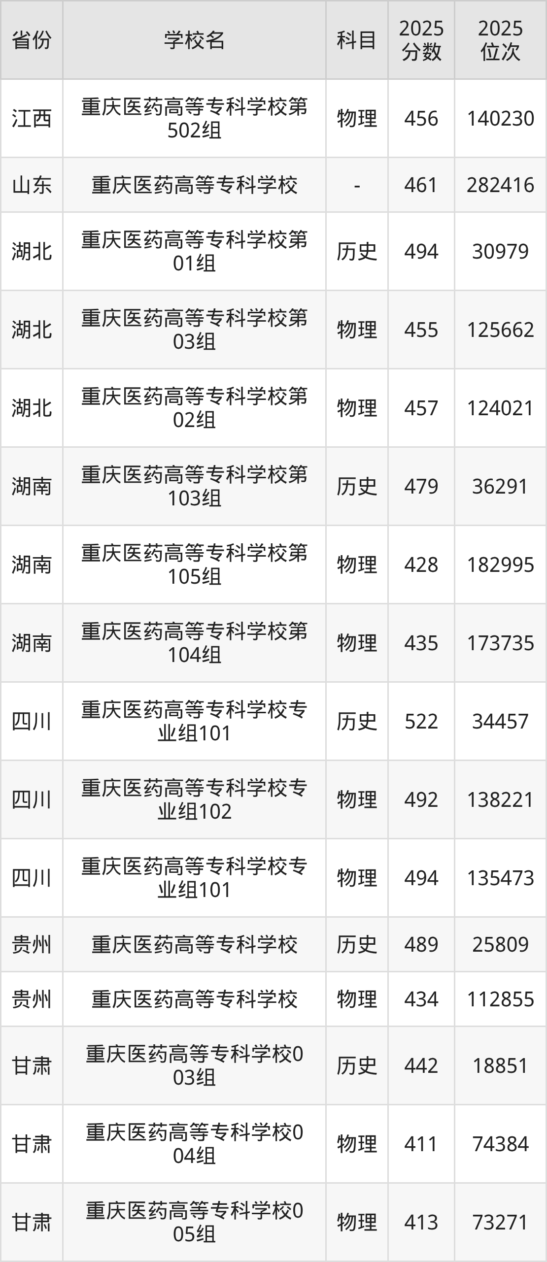 2025年重庆医药高等专科学校历史类最低分437分(35576名)、物理类最低分404分(111757名)。