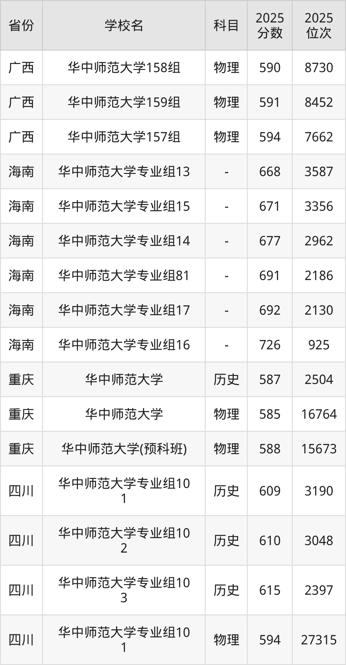 2025年华中师范大学历史类最低分598分(3467名)、物理类最低分584分(22070名)。