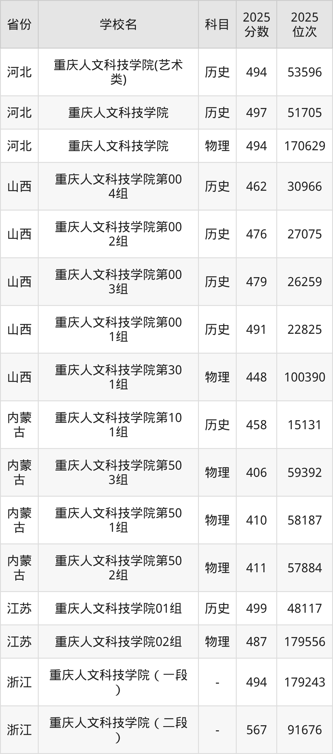2025年重庆人文科技学院历史类最低分442分(34085名)、物理类最低分457分(87578名)。
