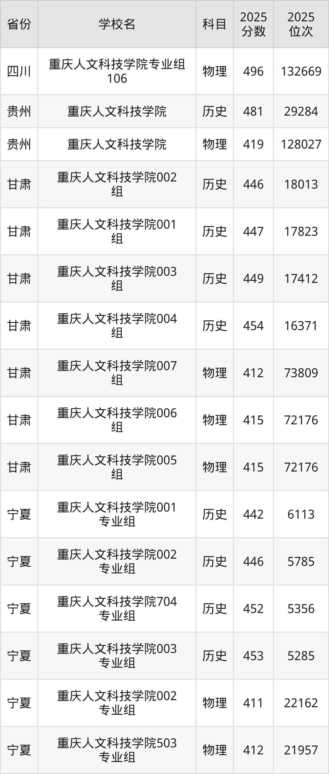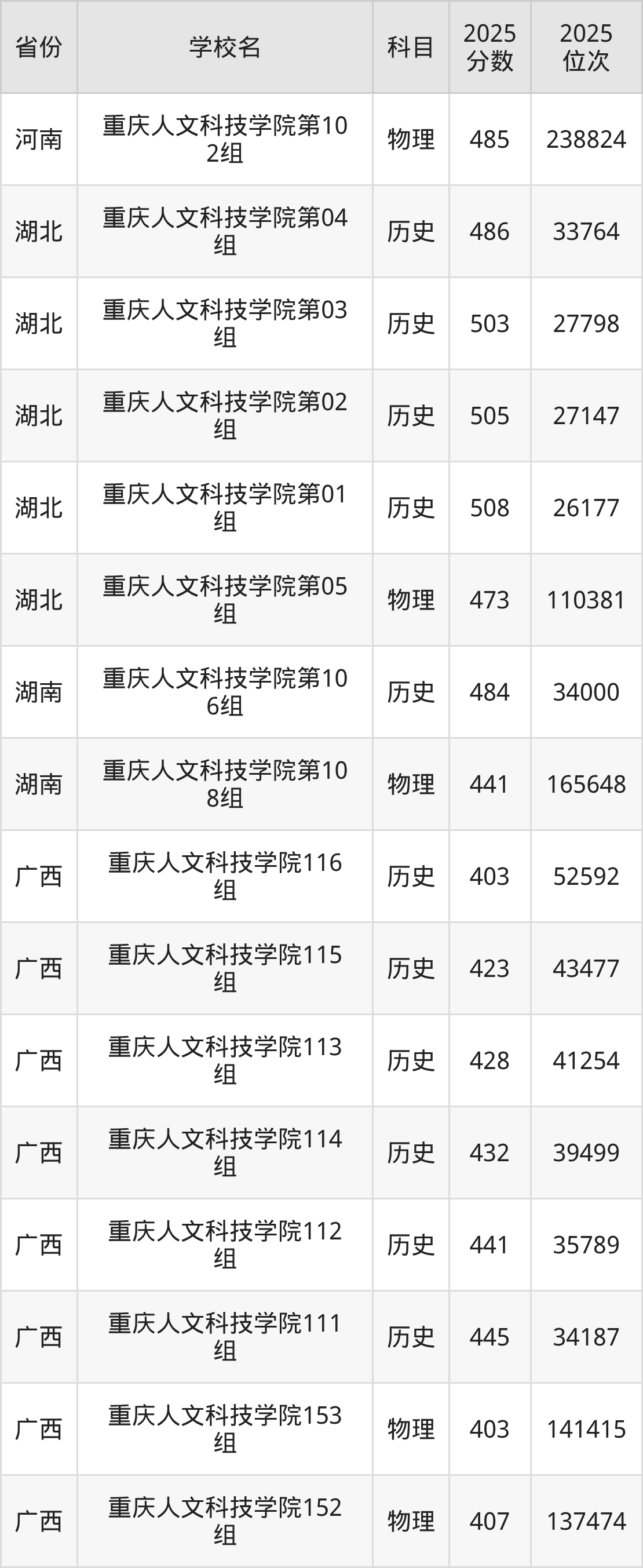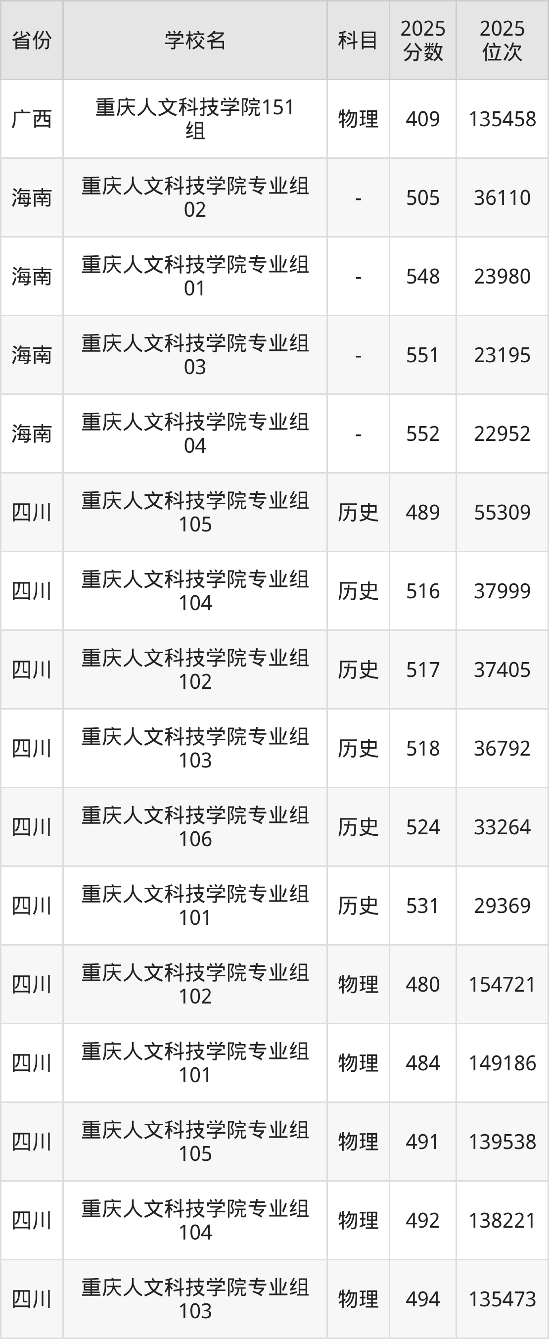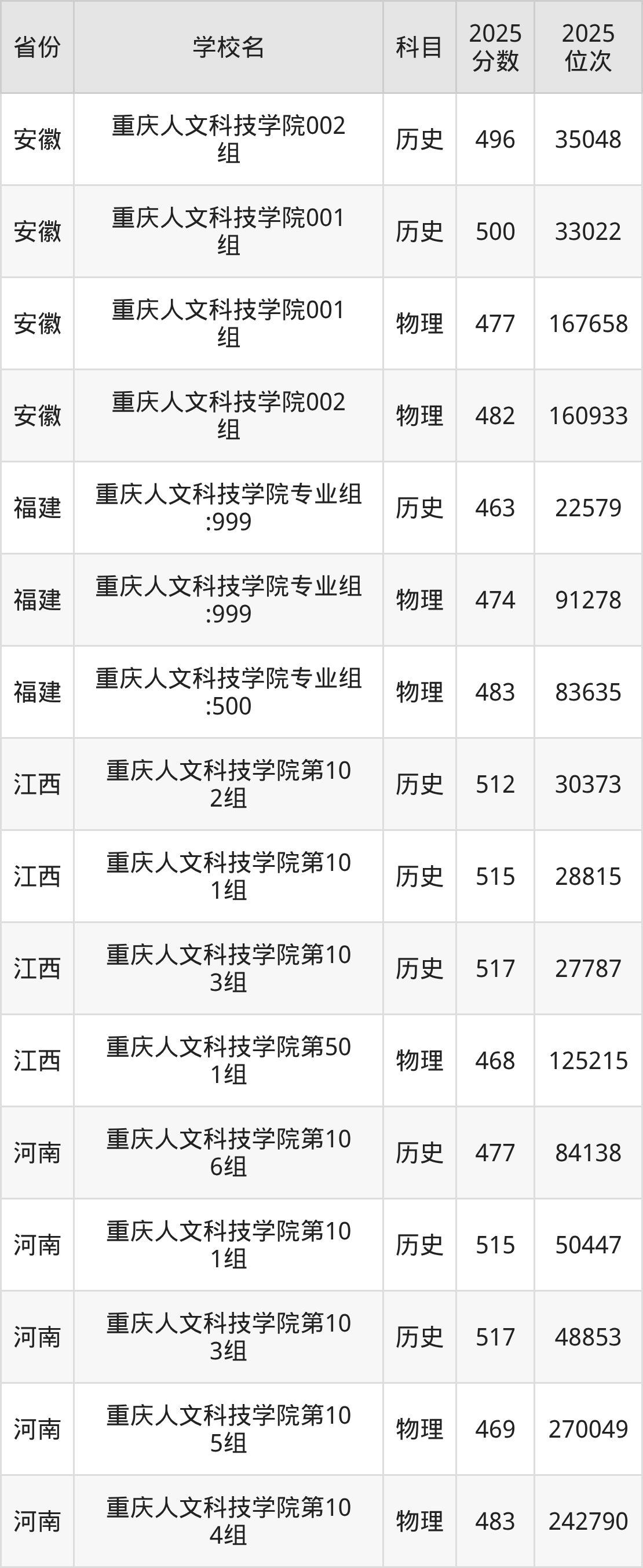 | 重庆人文科技学 院 | 历史 | 442 | 34085 |