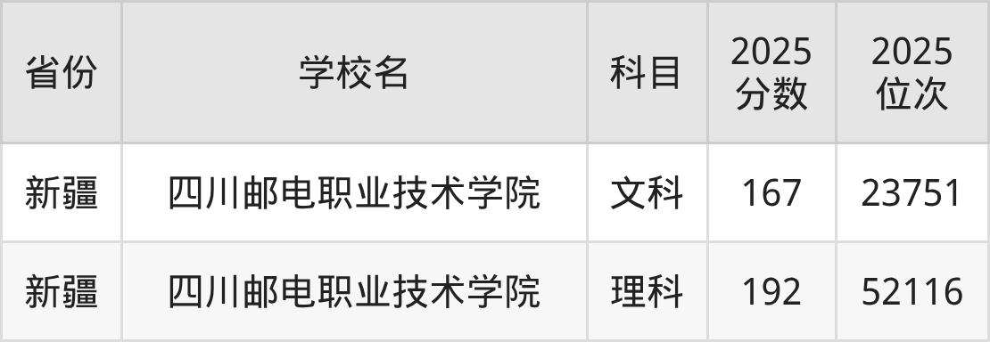 2025年四川邮电职业技术学院在省外录取分数线范围整体位于167分到192分之间,录取分数线最低在新疆文科、录取分数线最高在新疆理科。