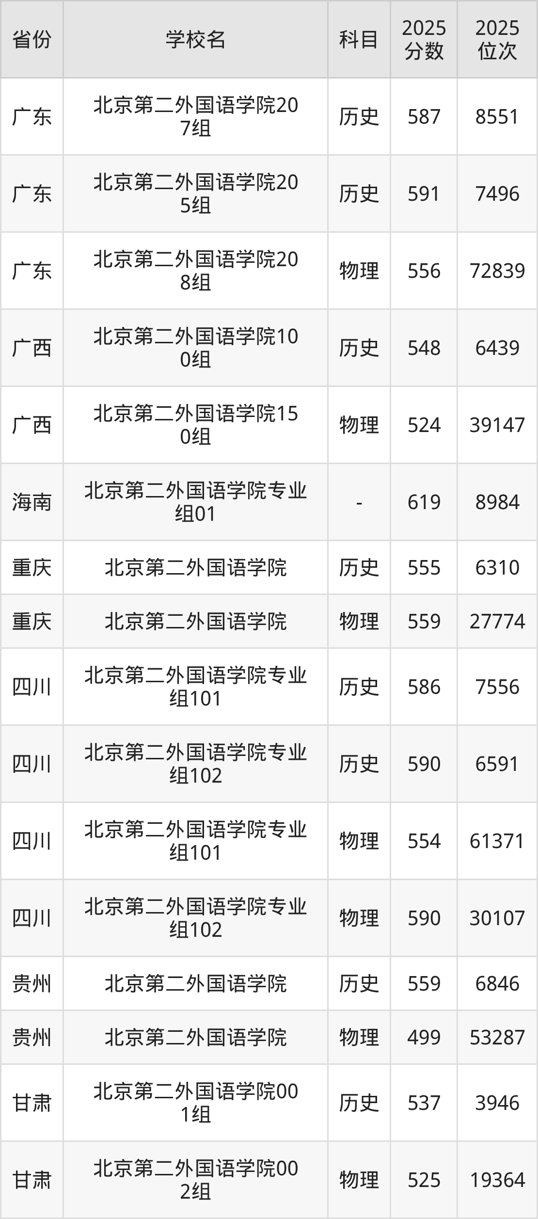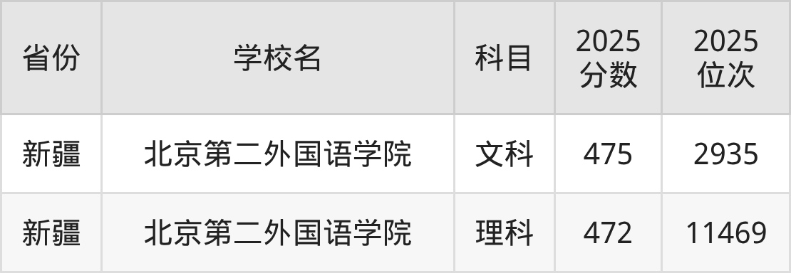 2025年北京第二外国语学院在市外录取分数线范围整体位于472分到619分之间,录取分数线最低在新疆理科、录取分数线最高在海南(专业组01)。