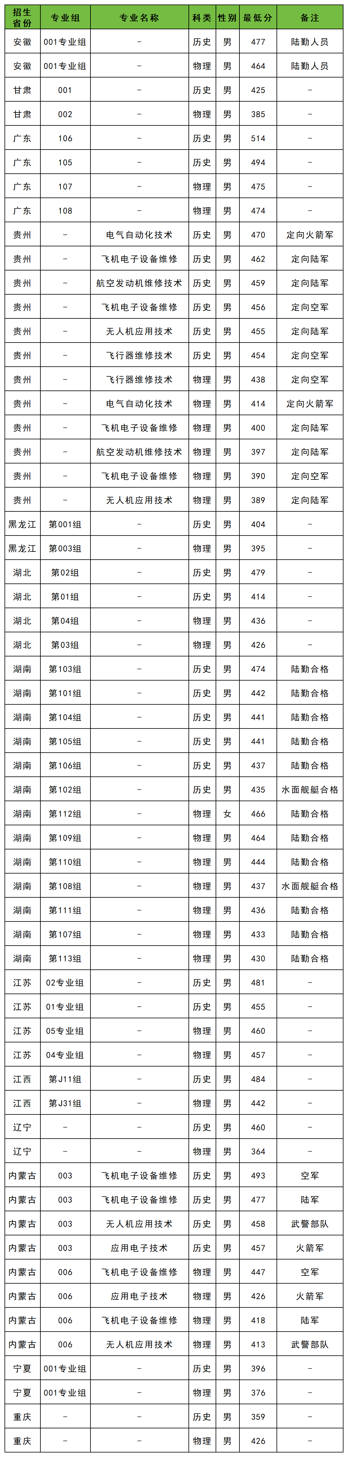 下面是长沙航空职业技术学院2025年在全国各省定向士官招生分数线一览表,供参考: