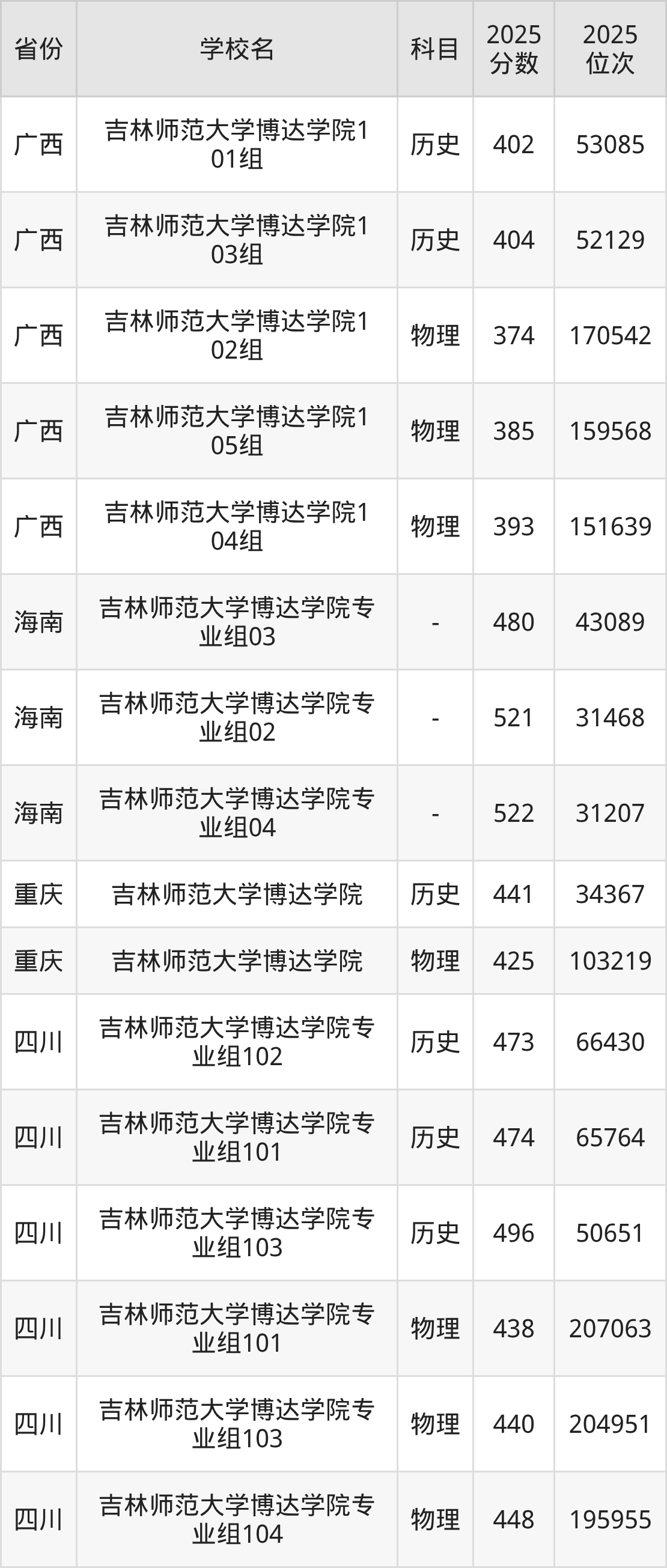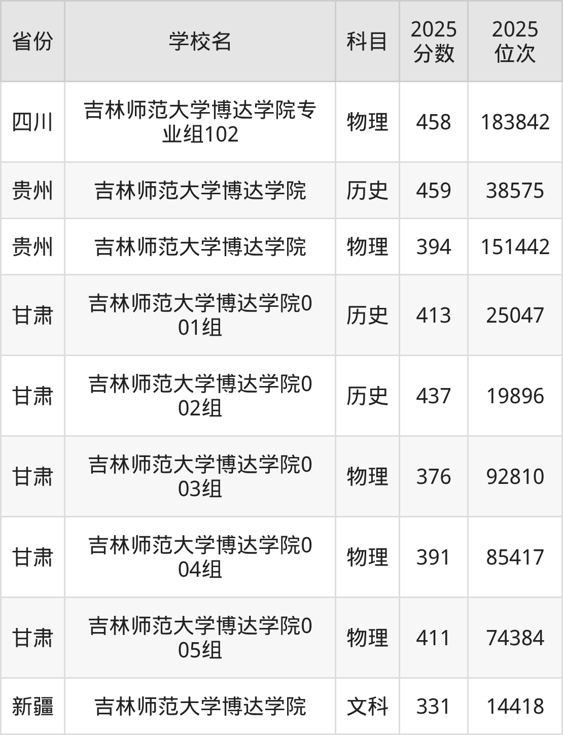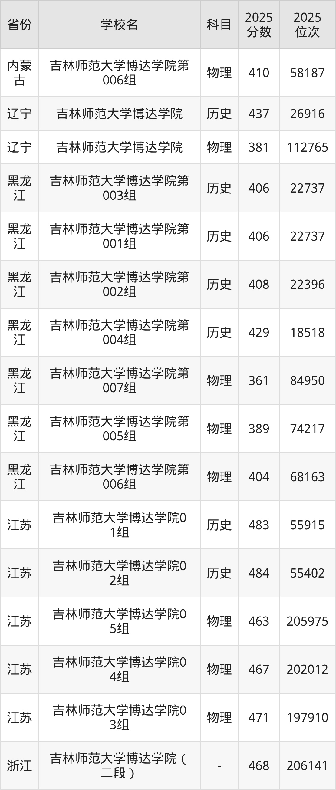 2025年吉林师范大学博达学院在省内,其中历史类最低分是401分、对应位次是19807名;物理类最低分是353分,对应位次是66904名。