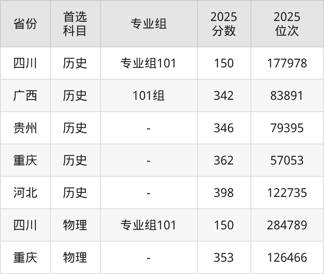 历史类最低分对应地区为四川(专业组101),录取位次为177978;最高分对应地区为河北,录取位次为122735,超专科线198分。