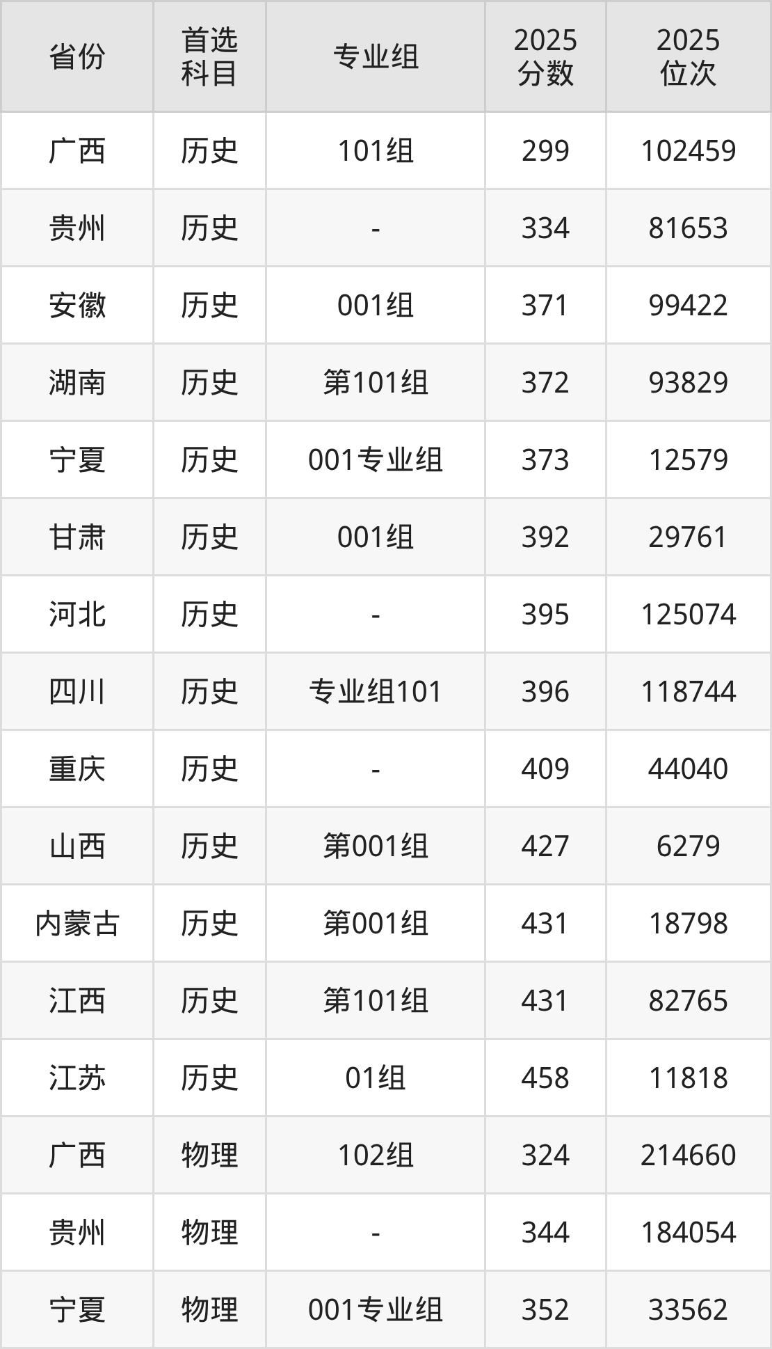 历史类最低分对应地区为广西(101组),录取位次为102459,超专科线99分;最高分对应地区为江苏(01组),录取位次为11818,超专科线238分。