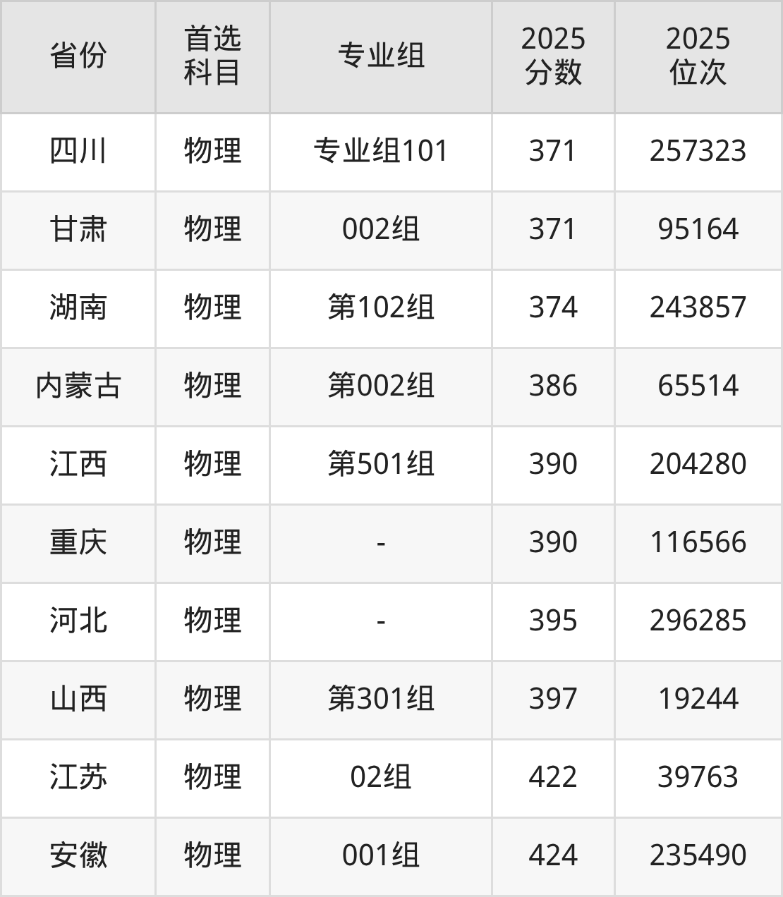 物理类最低分对应地区为广西(102组),录取位次为214660,超专科线124分;最高分对应地区为安徽(001组),录取位次为235490,超专科线224分。