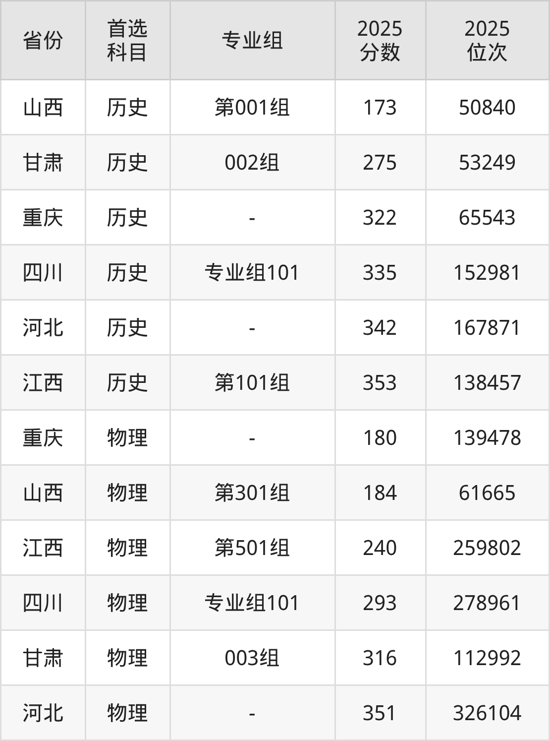 历史类最低分对应地区为山西(第001组),录取位次为50840,超专科线73分;最高分对应地区为江西(第101组),录取位次为138457,超专科线63分。