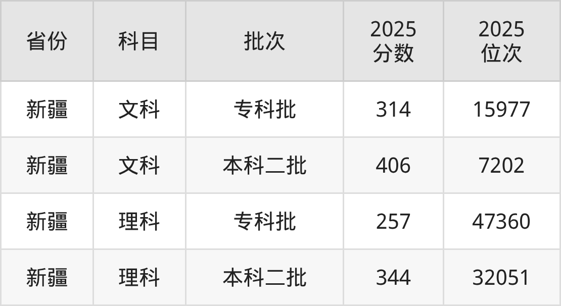文科最低分对应地区为新疆,录取位次为15977,超专科线174分;最高分对应地区为新疆,录取位次为7202,超二本线76分。