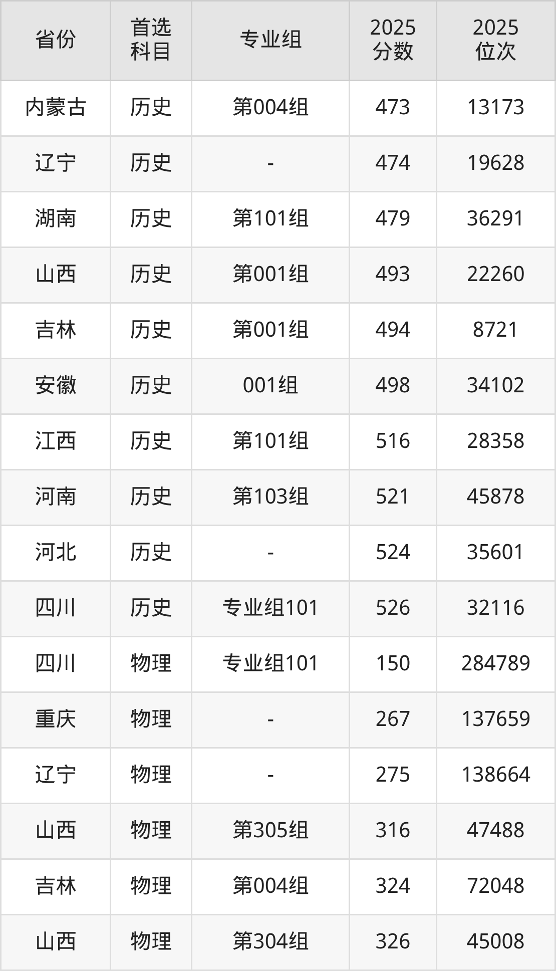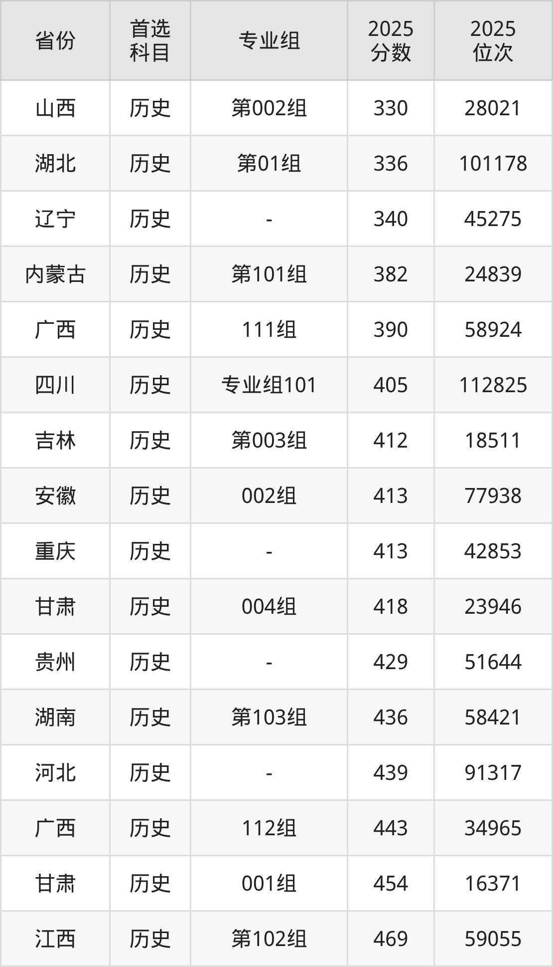 历史类最低分对应地区为山西(第002组),录取位次为28021;最高分对应地区为四川(专业组101),录取位次为32116,超本科B59分。