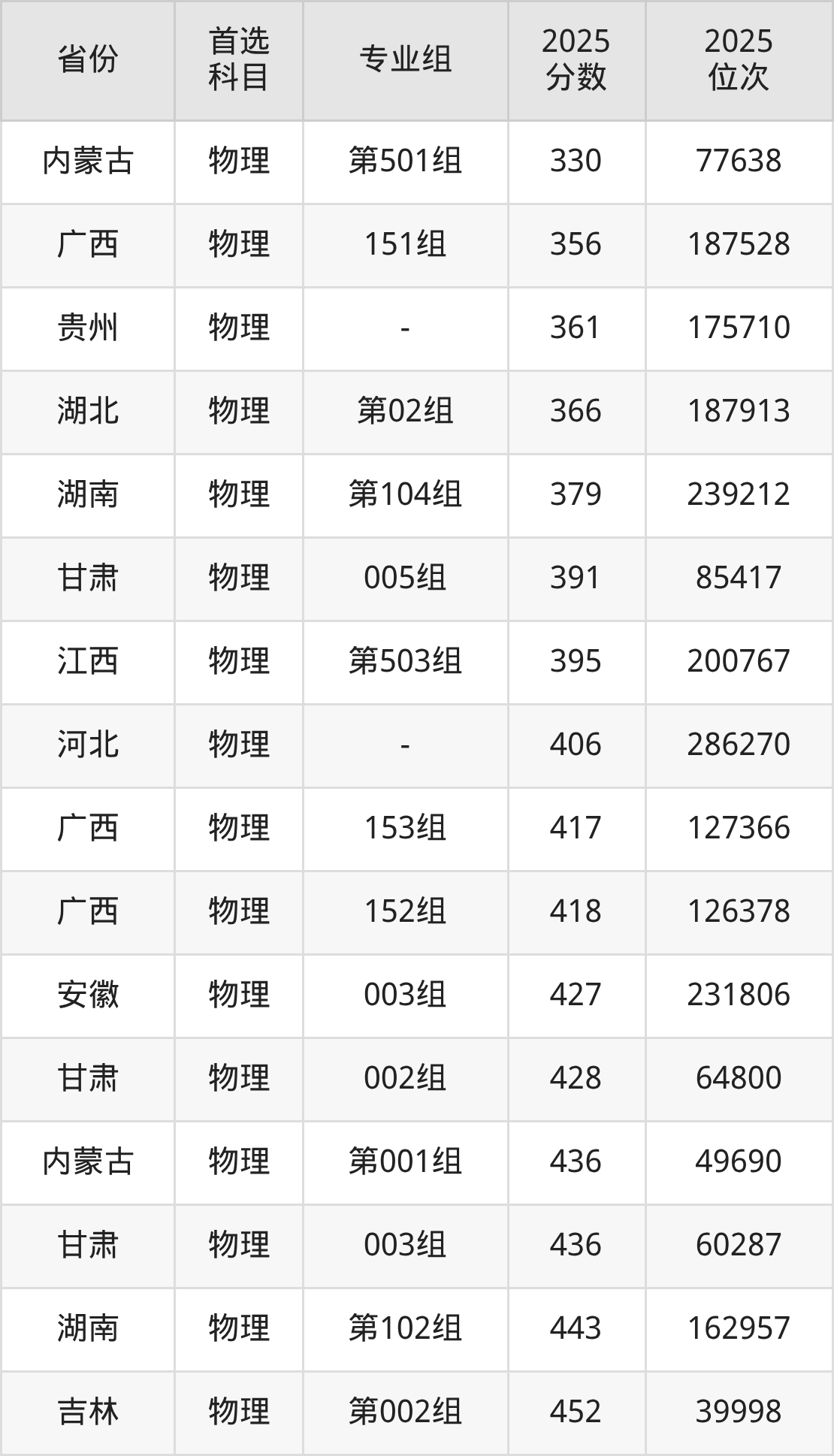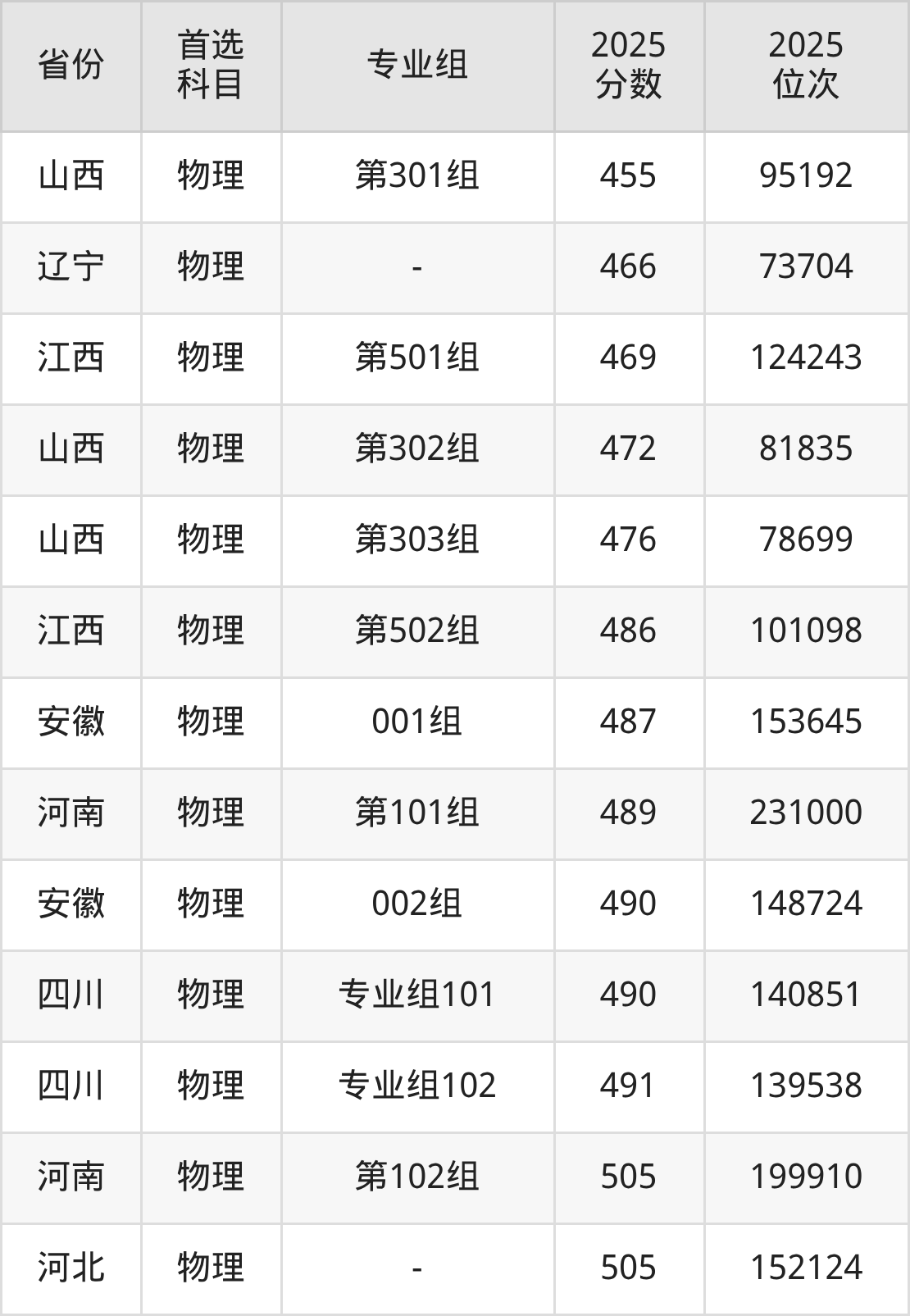 物理类:275分、138664名,466分、73704名;