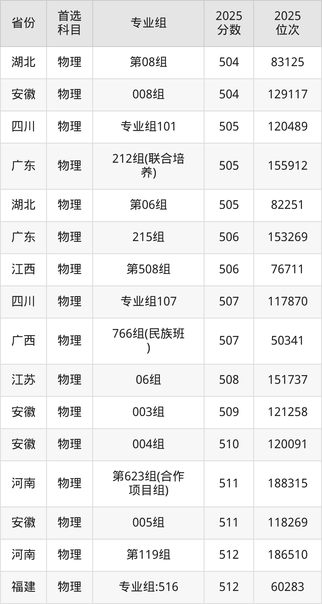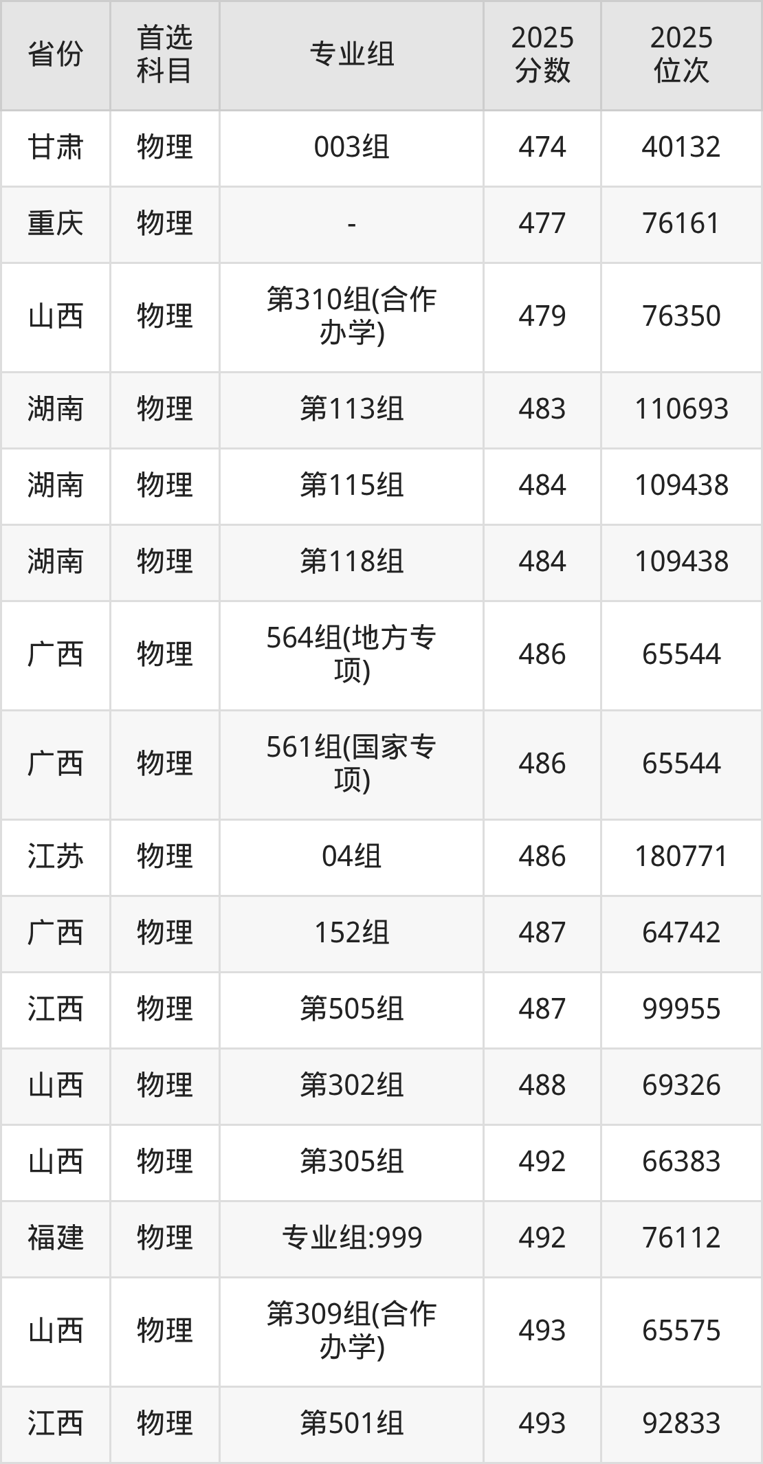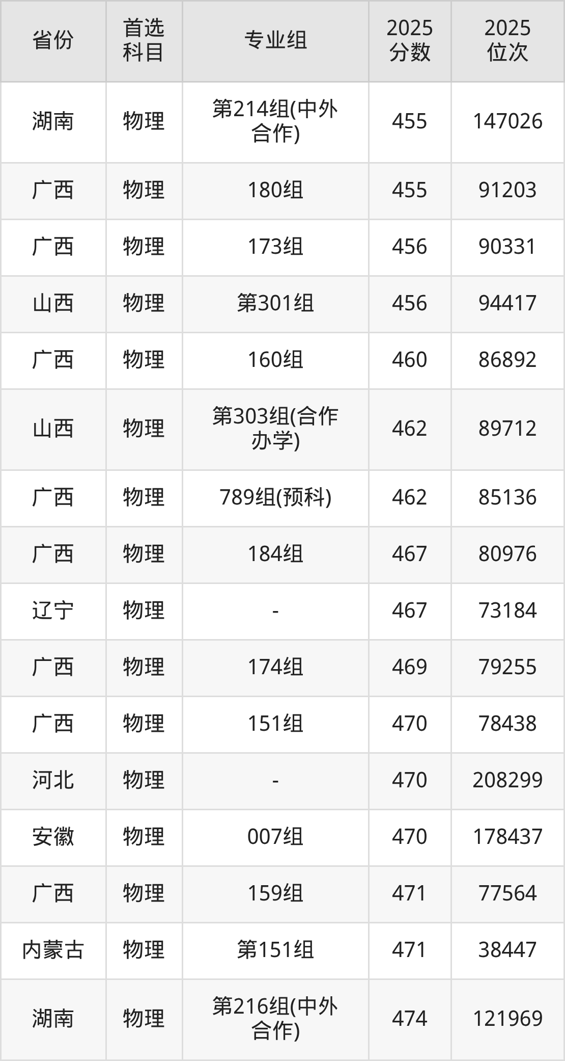 物理类最低分对应地区为广西(177组),录取位次为152660,超本科线22分;最高分对应地区为广东(216组),录取位次为91464,超本科线107分。