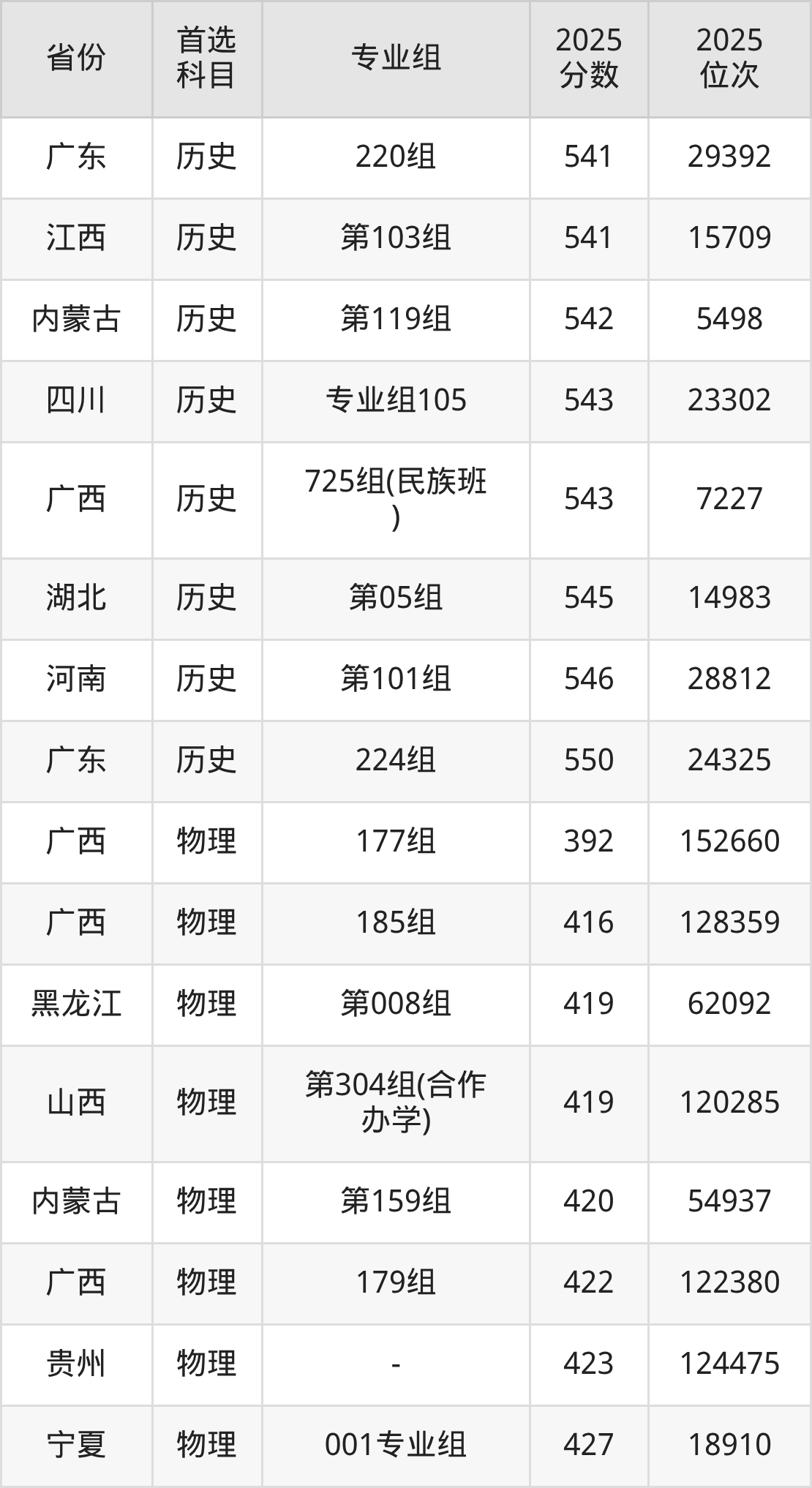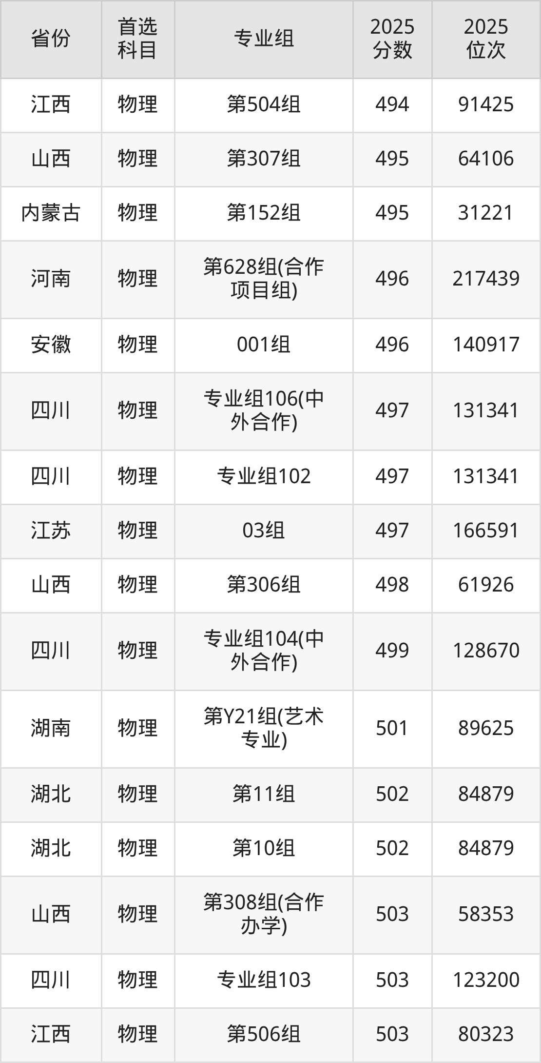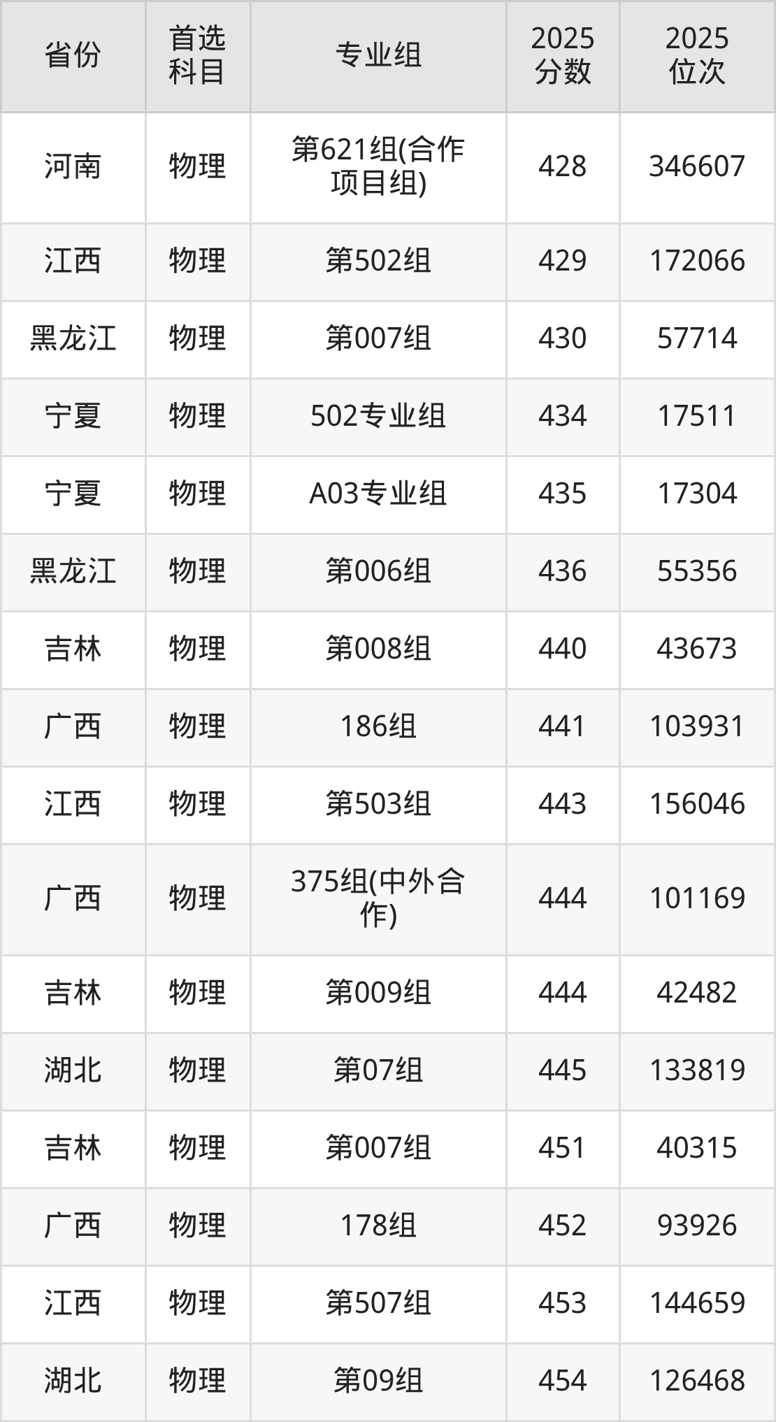 物理类最低分对应地区为广西(177组),录取位次为152660,超本科线22分;最高分对应地区为广东(216组),录取位次为91464,超本科线107分。