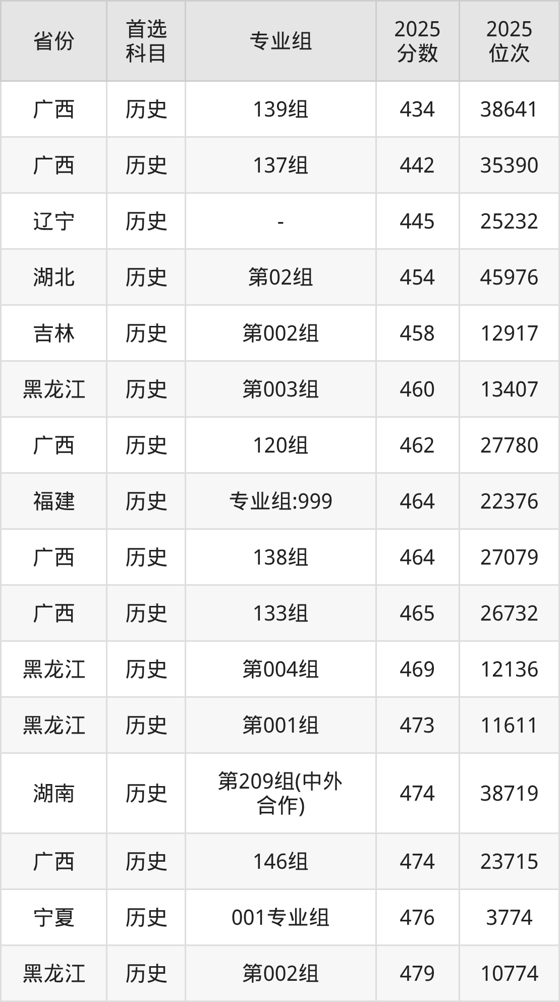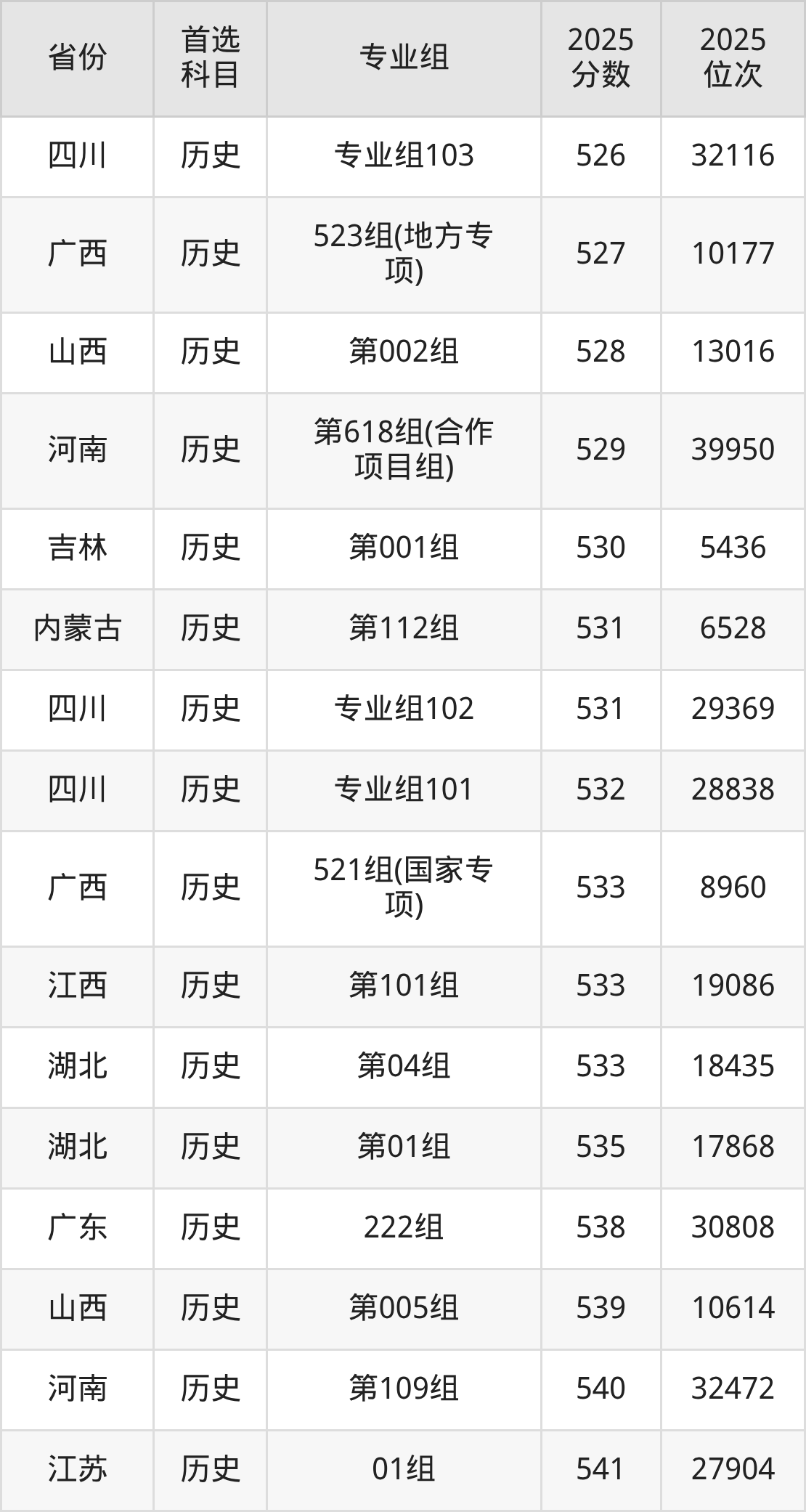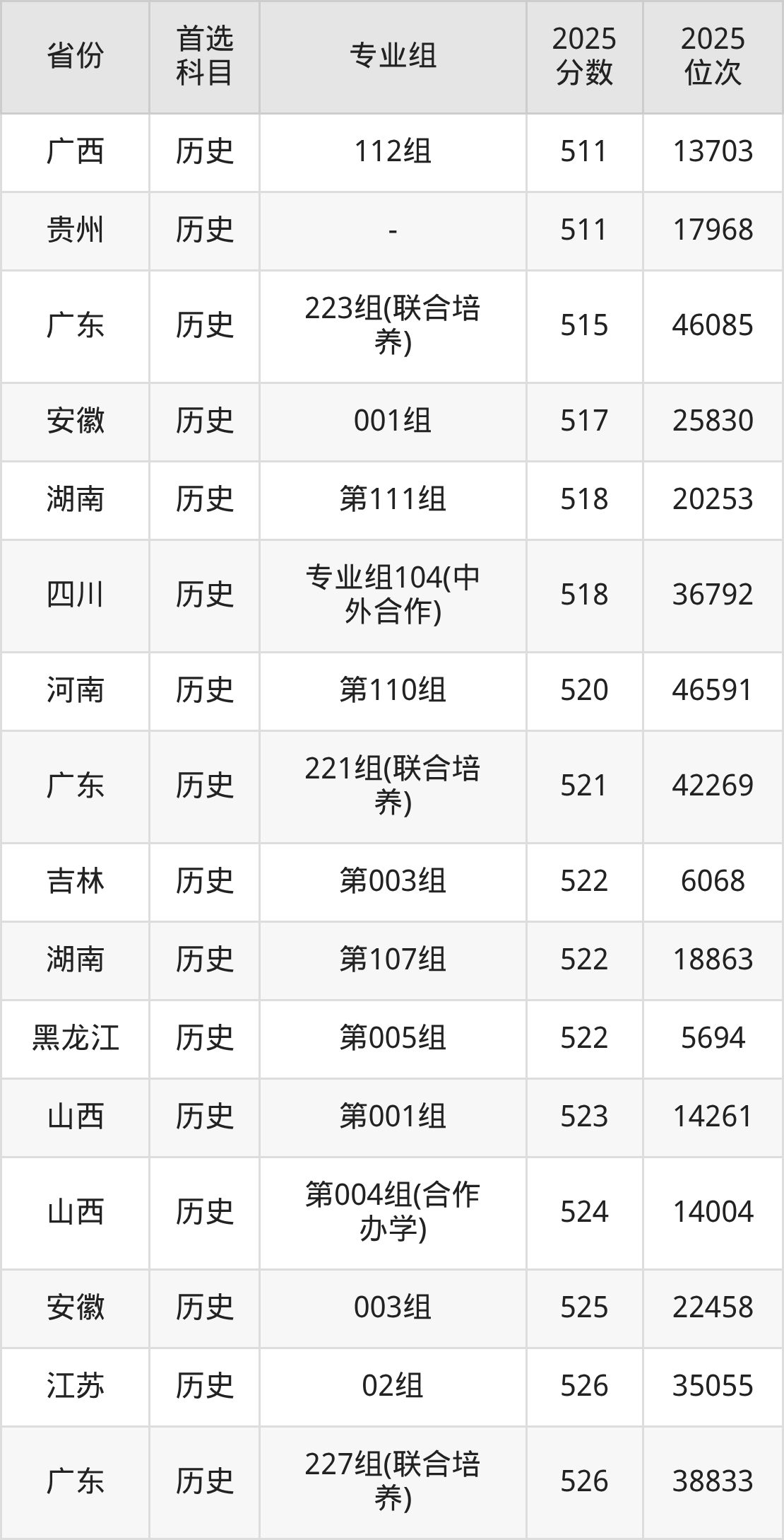 历史类最低分对应地区为广西(139组),录取位次为38641,超本科线32分;最高分对应地区为广东(224组),录取位次为24325,超本科线86分。