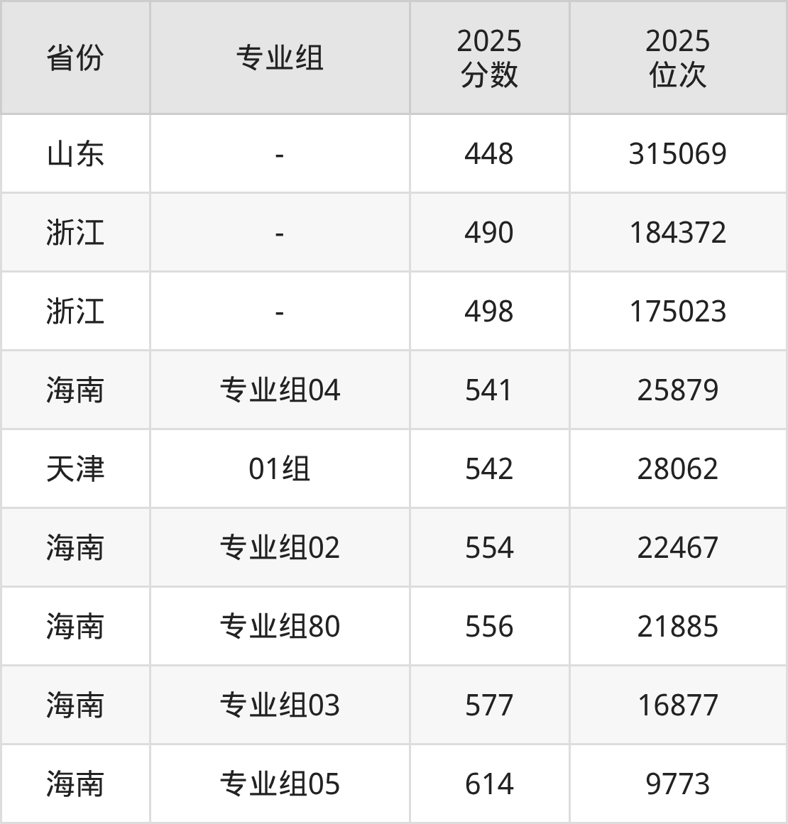 最低分对应地区为山东,录取位次为315069,超一段线35分;最高分对应地区为海南(专业组05),录取位次为9773,超本科线134分。
