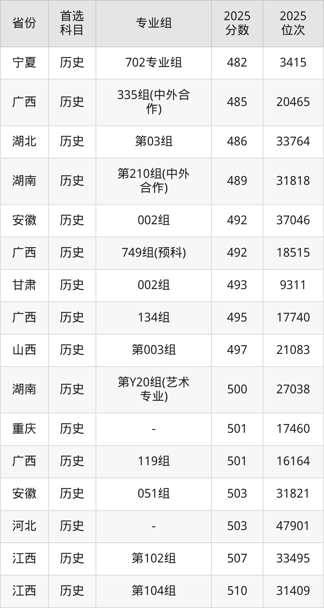 历史类:112组511分、13703名,119组501分、16164名,120组462分、27780名,133组465分、26732名,134组495分、17740名,137组442分、35390名,138组464分、27079名,139组434分、38641名,146组474分、23715名,335组(中外合作)485分、20465名,521组(国家专项)533分、8960名,523组(地方专项)527分、10177名,725组(民族班)543分、7227名,749组(预科)492分、18515名;
