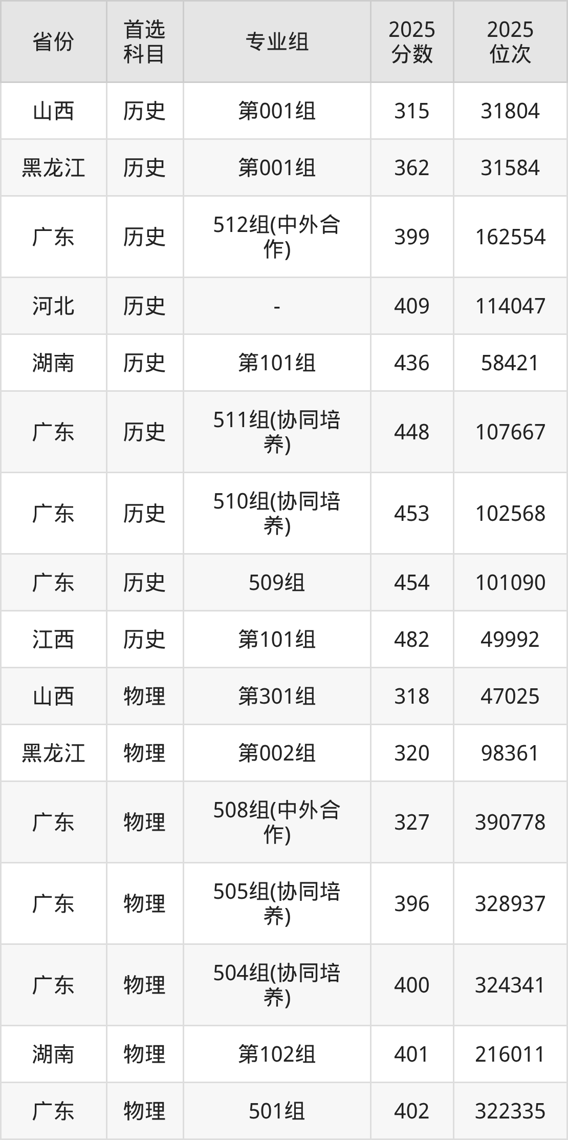 历史类:509组454分、101090名,510组(协同培养)453分、102568名,511组(协同培养)448分、107667名,512组(中外合作)399分、162554名;