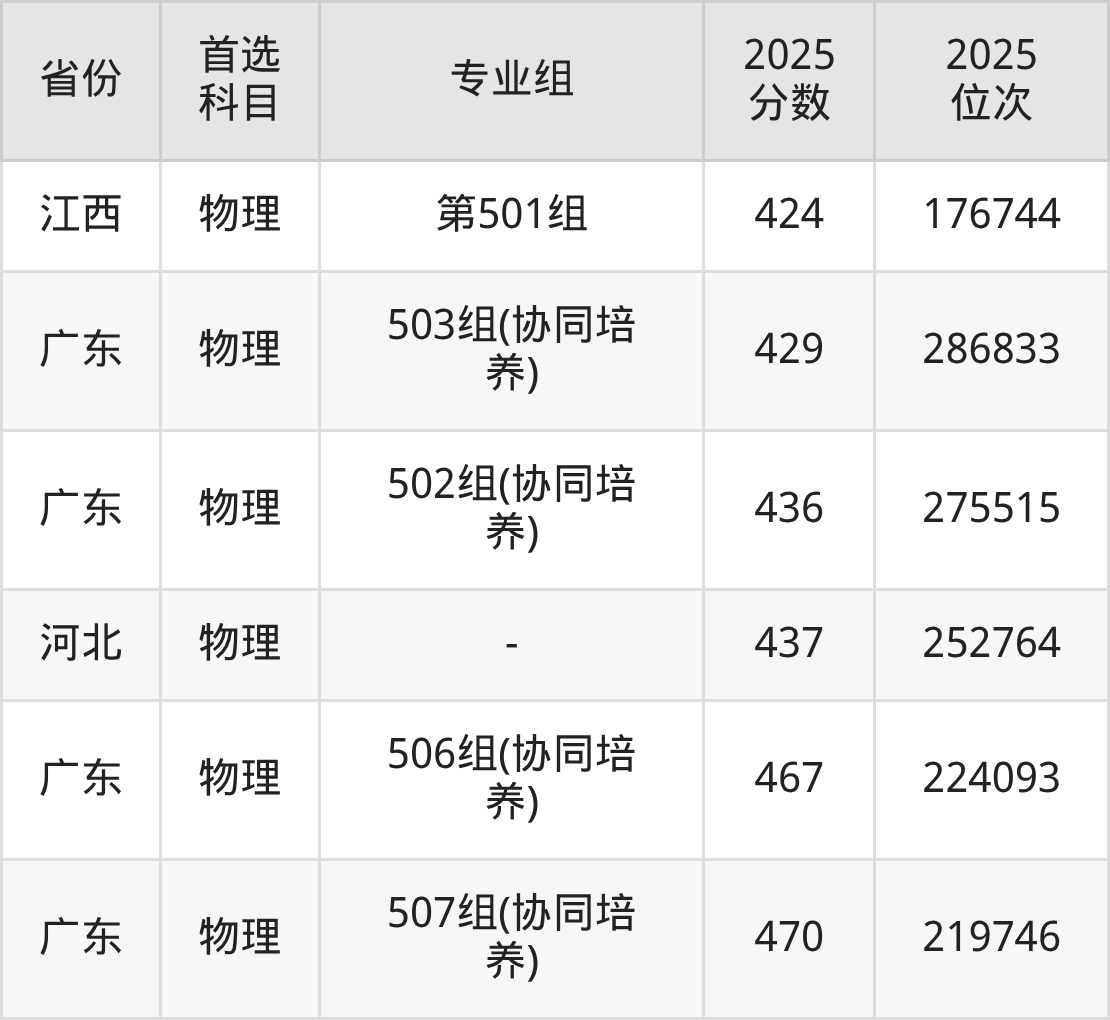 物理类:501组402分、322335名,502组(协同培养)436分、275515名,503组(协同培养)429分、286833名,504组(协同培养)400分、324341名,505组(协同培养)396分、328937名,506组(协同培养)467分、224093名,507组(协同培养)470分、219746名,508组(中外合作)327分、390778名;