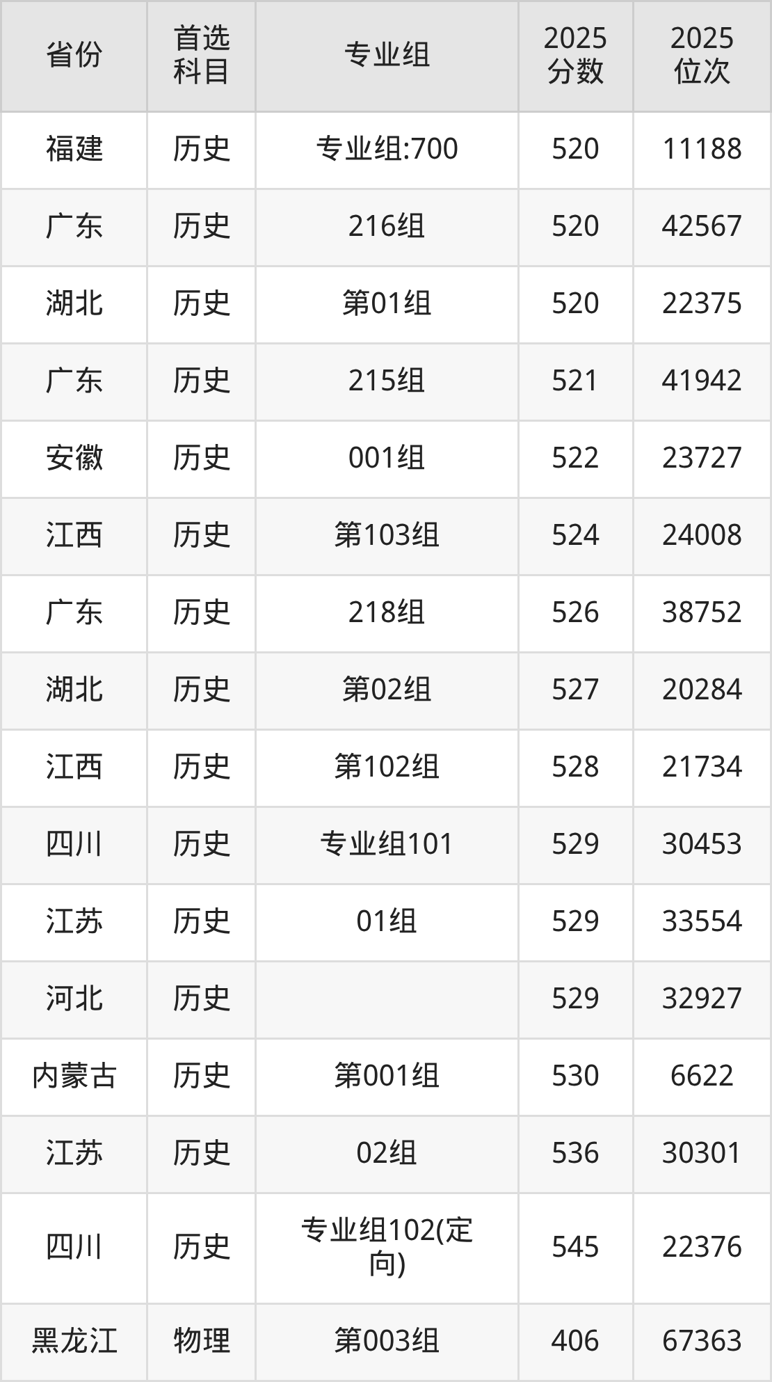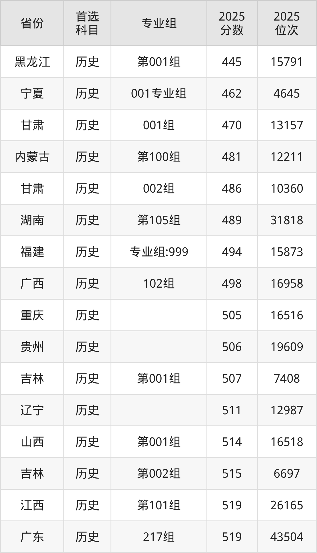 历史类最低分对应地区为黑龙江(第001组),录取位次为15791;最高分对应地区为四川(专业组102(定向)),录取位次为22376,超本科B78分。