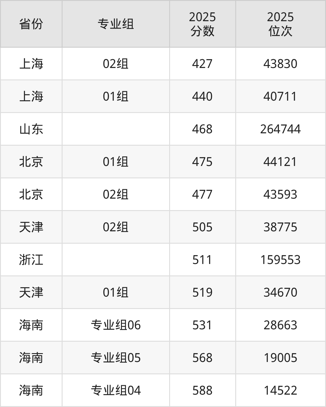 最低分对应地区为上海(02组),录取位次为43830,超本科线25分;最高分对应地区为海南(专业组04),录取位次为14522,超本科线108分。