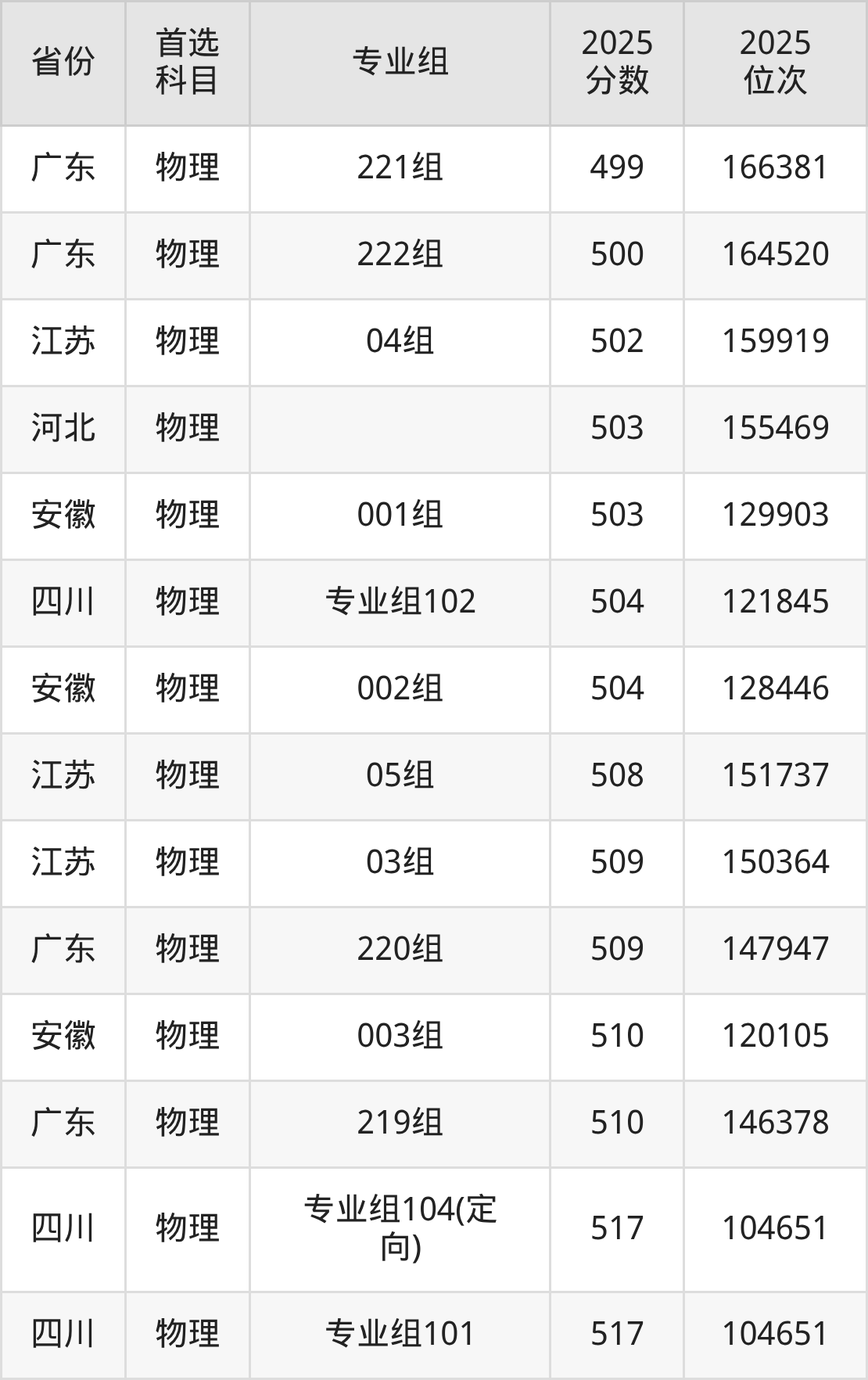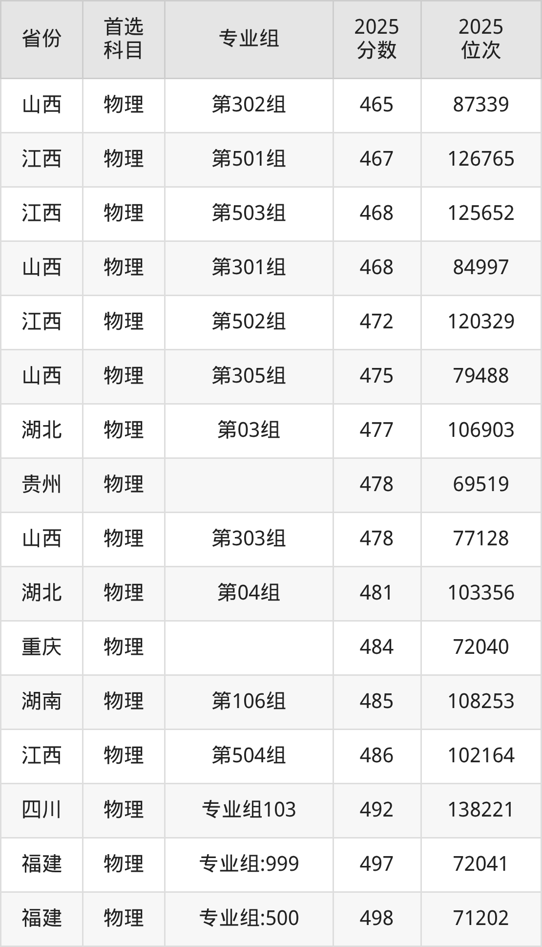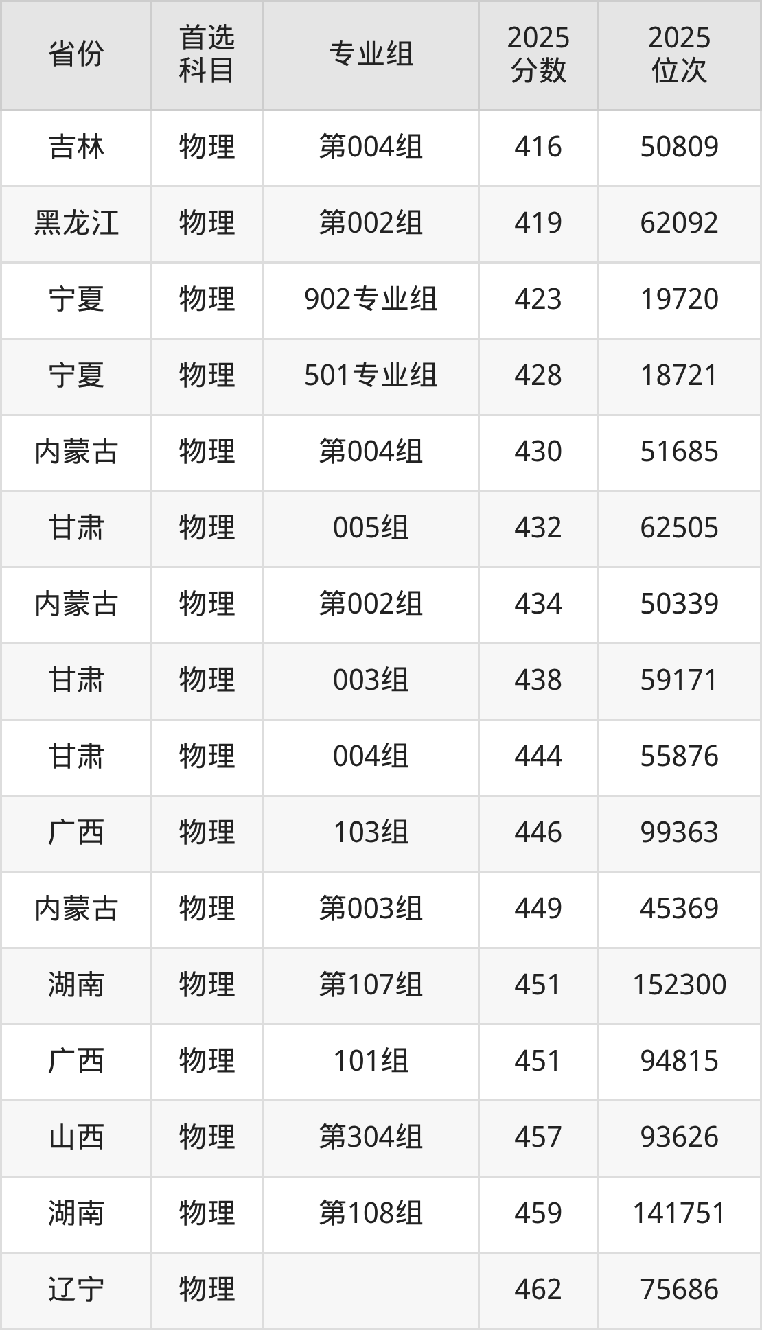 物理类最低分对应地区为黑龙江(第003组),录取位次为67363,超本科线46分;最高分对应地区为四川(专业组101),录取位次为104651,超本科B79分。
