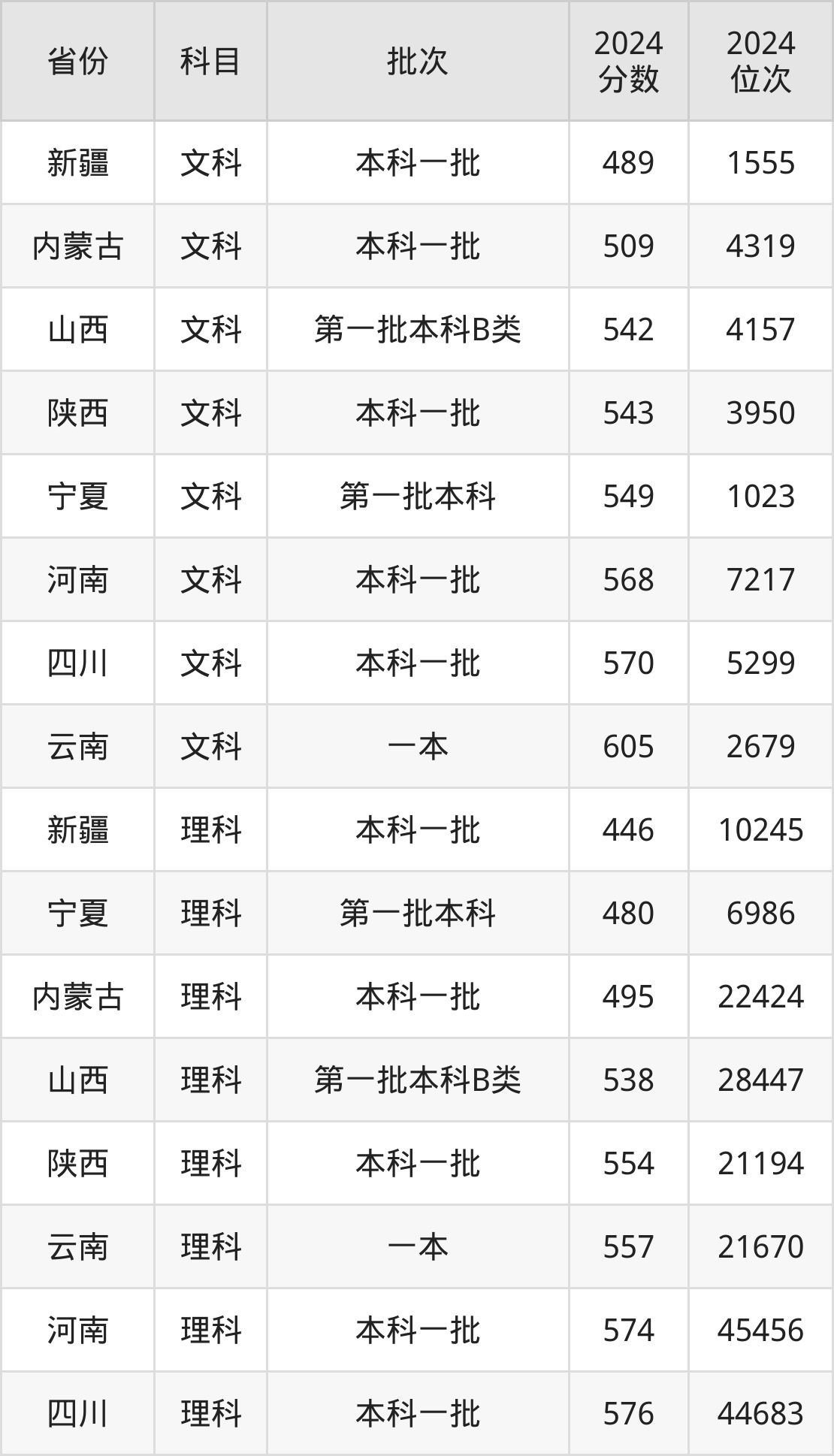 文科最低分对应地区为新疆,录取位次为1555,超一本线64分;最高分对应地区为云南,录取位次为2679,超一本线55分。