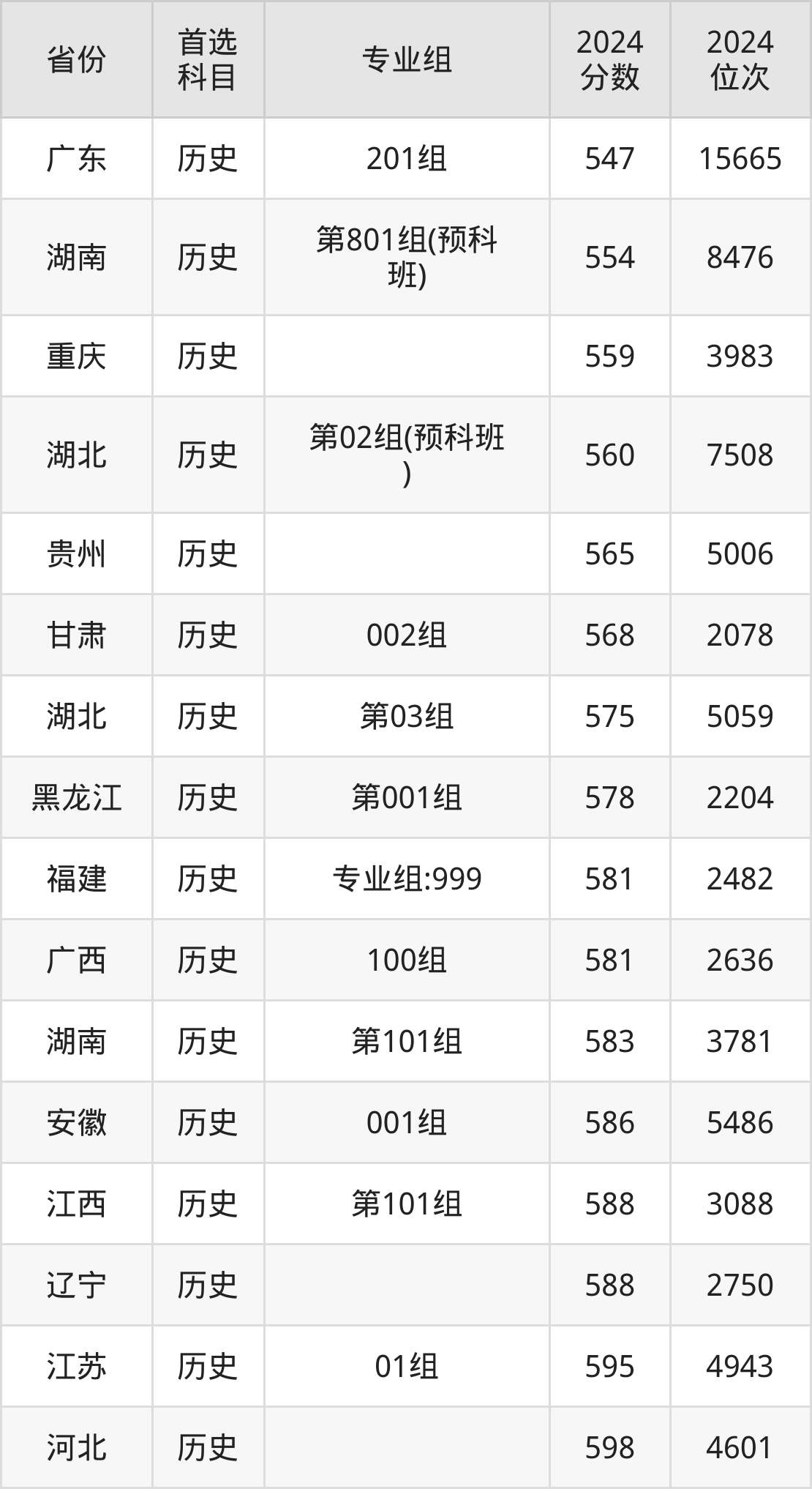 历史类最低分对应地区为广东(201组),录取位次为15665,超本科线119分;最高分对应地区为河北,录取位次为4601,超本科线149分。