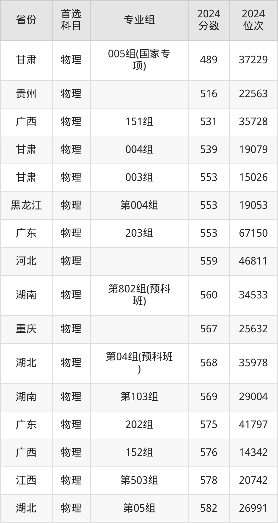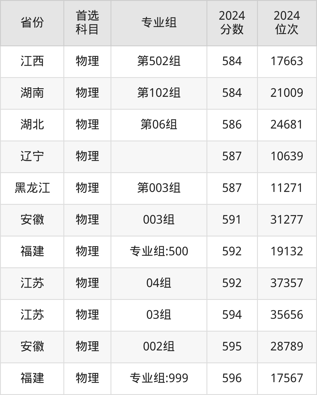 物理类最低分对应地区为甘肃(005组(国家专项)),录取位次为37229,超本科线119分;最高分对应地区为福建(专业组:999),录取位次为17567,超本科线147分。