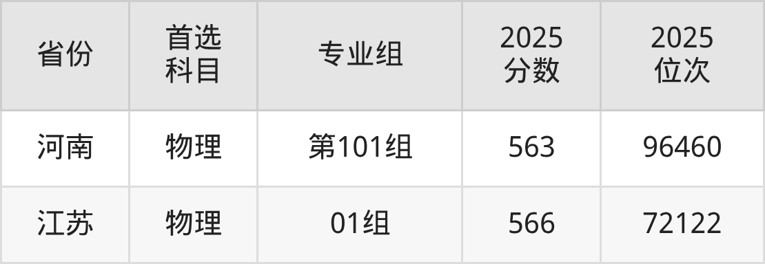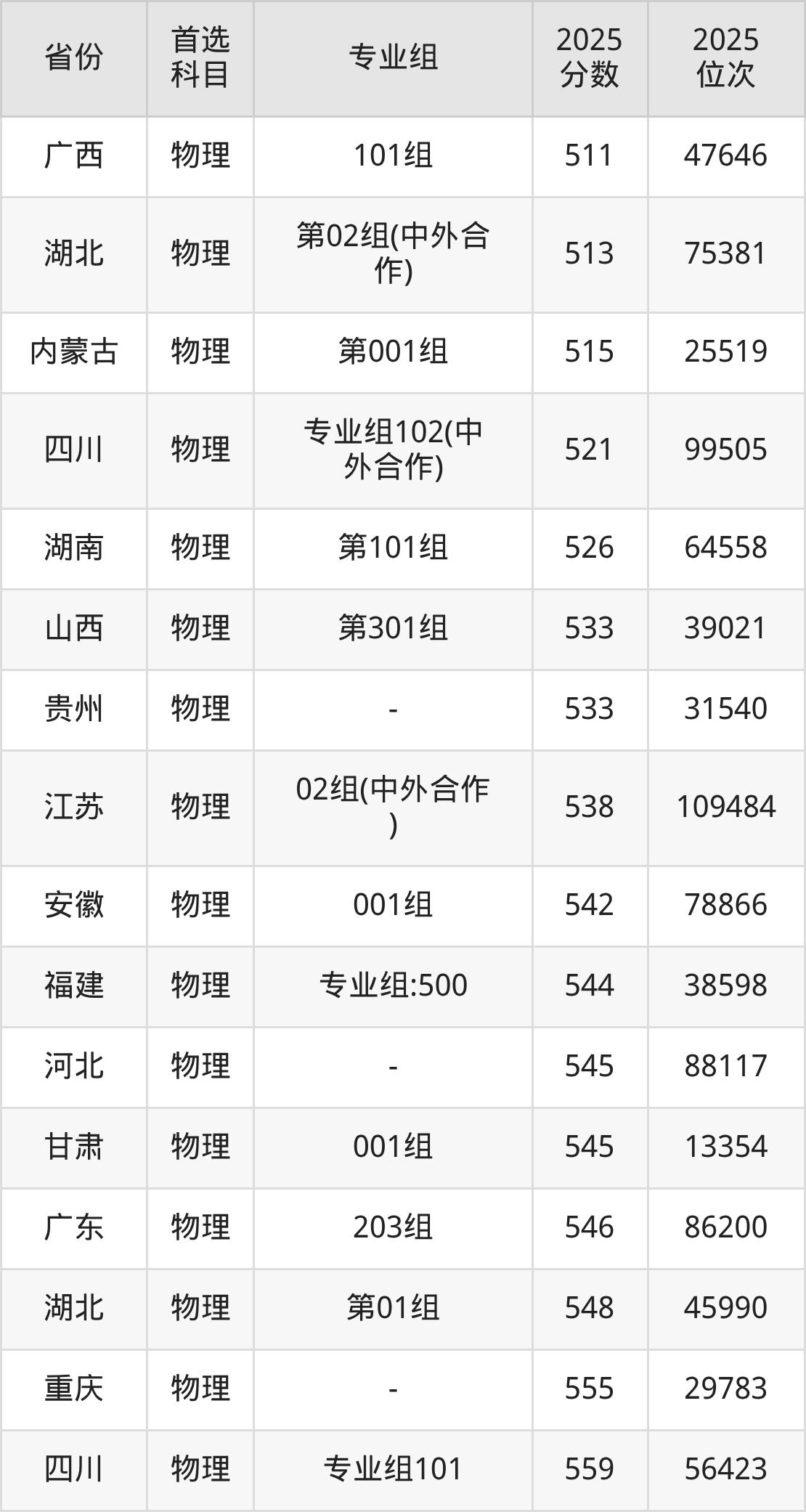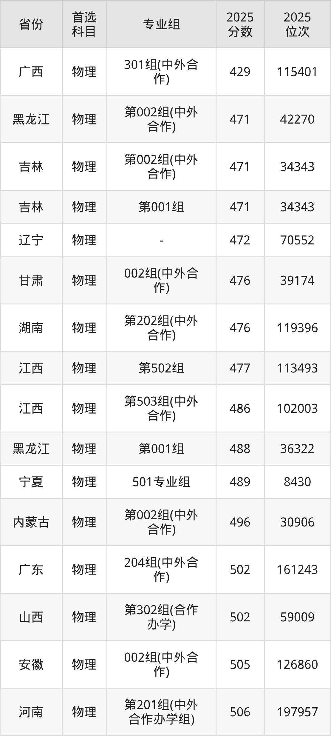 物理类最低分对应地区为广西(301组(中外合作)),录取位次为115401,超本科线59分;最高分对应地区为江苏(01组),录取位次为72122,超本科线103分。