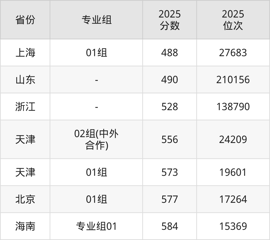 最低分对应地区为上海(01组),录取位次为27683,超本科线86分;最高分对应地区为海南(专业组01),录取位次为15369,超本科线104分。