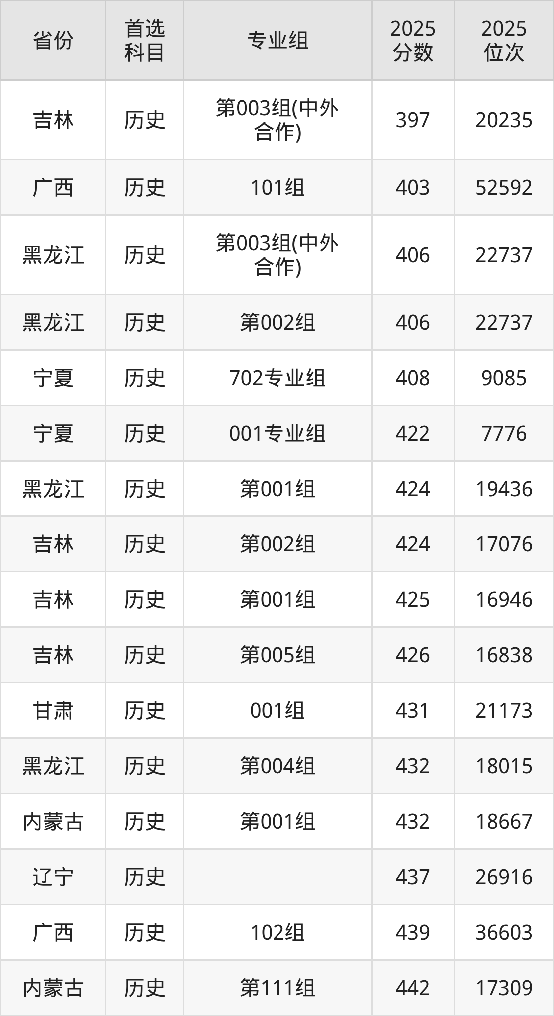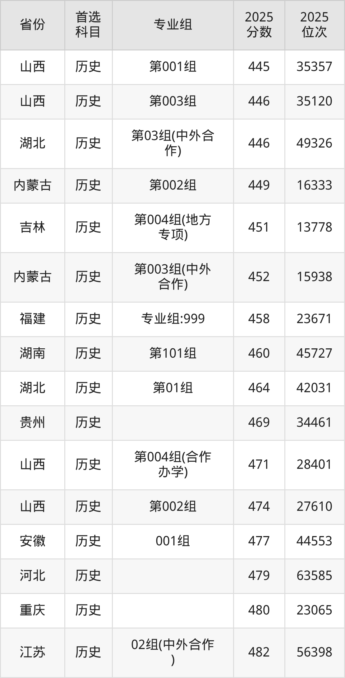历史类:第001组425分、16946名,第002组424分、17076名,第003组(中外合作)397分、20235名,第004组(地方专项)451分、13778名,第005组426分、16838名;