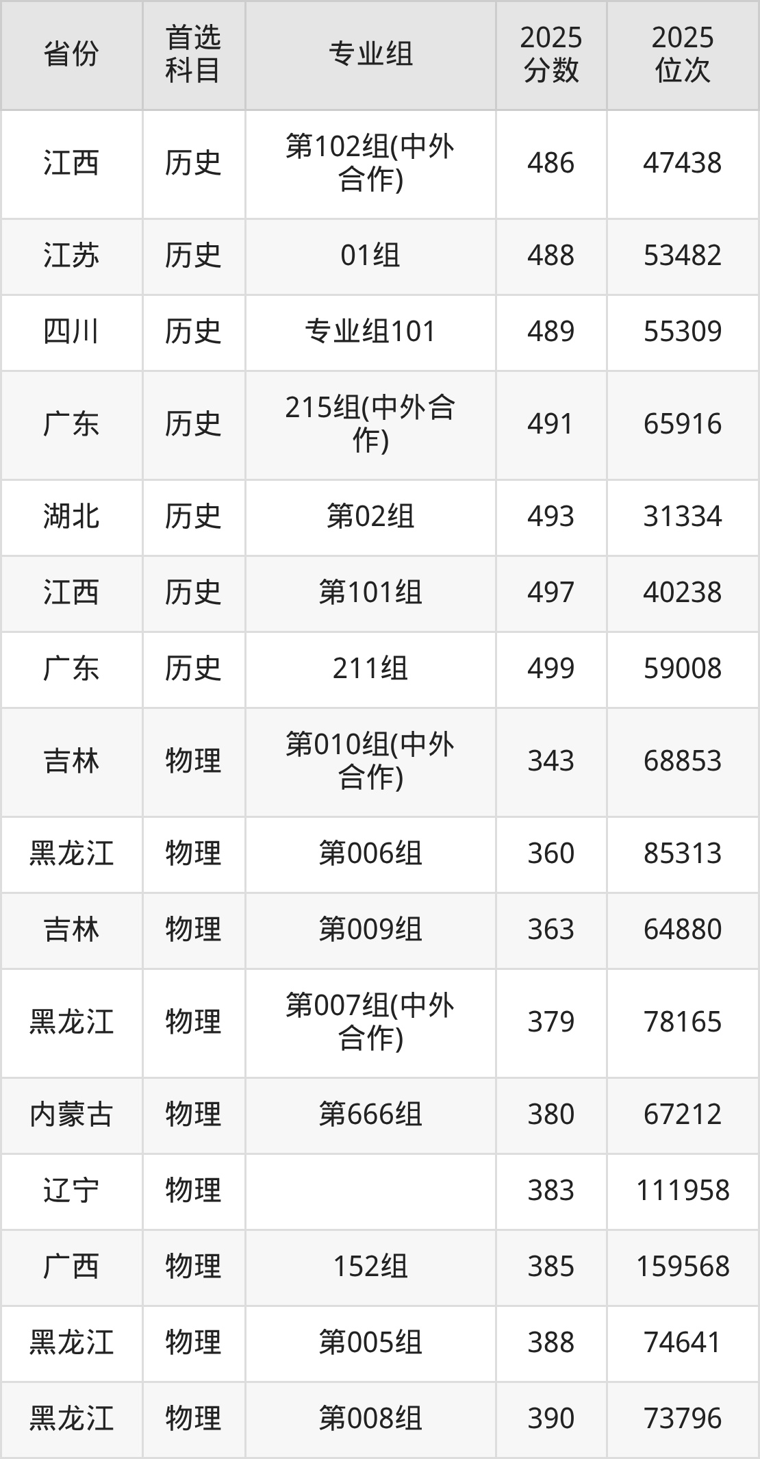 历史类最低分对应地区为吉林(第003组(中外合作)),录取位次为20235,超本科线13分;最高分对应地区为广东(211组),录取位次为59008,超本科线35分。