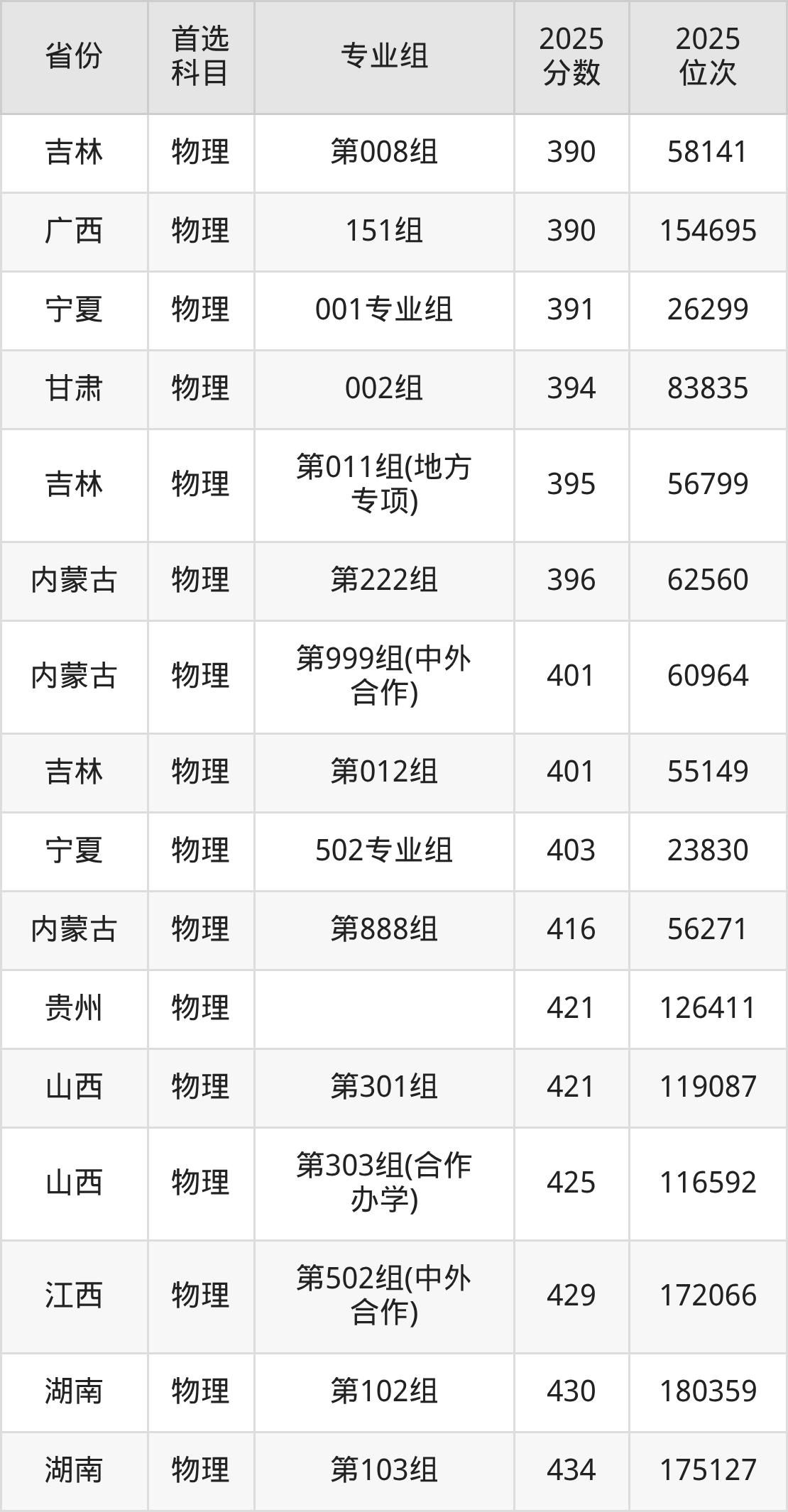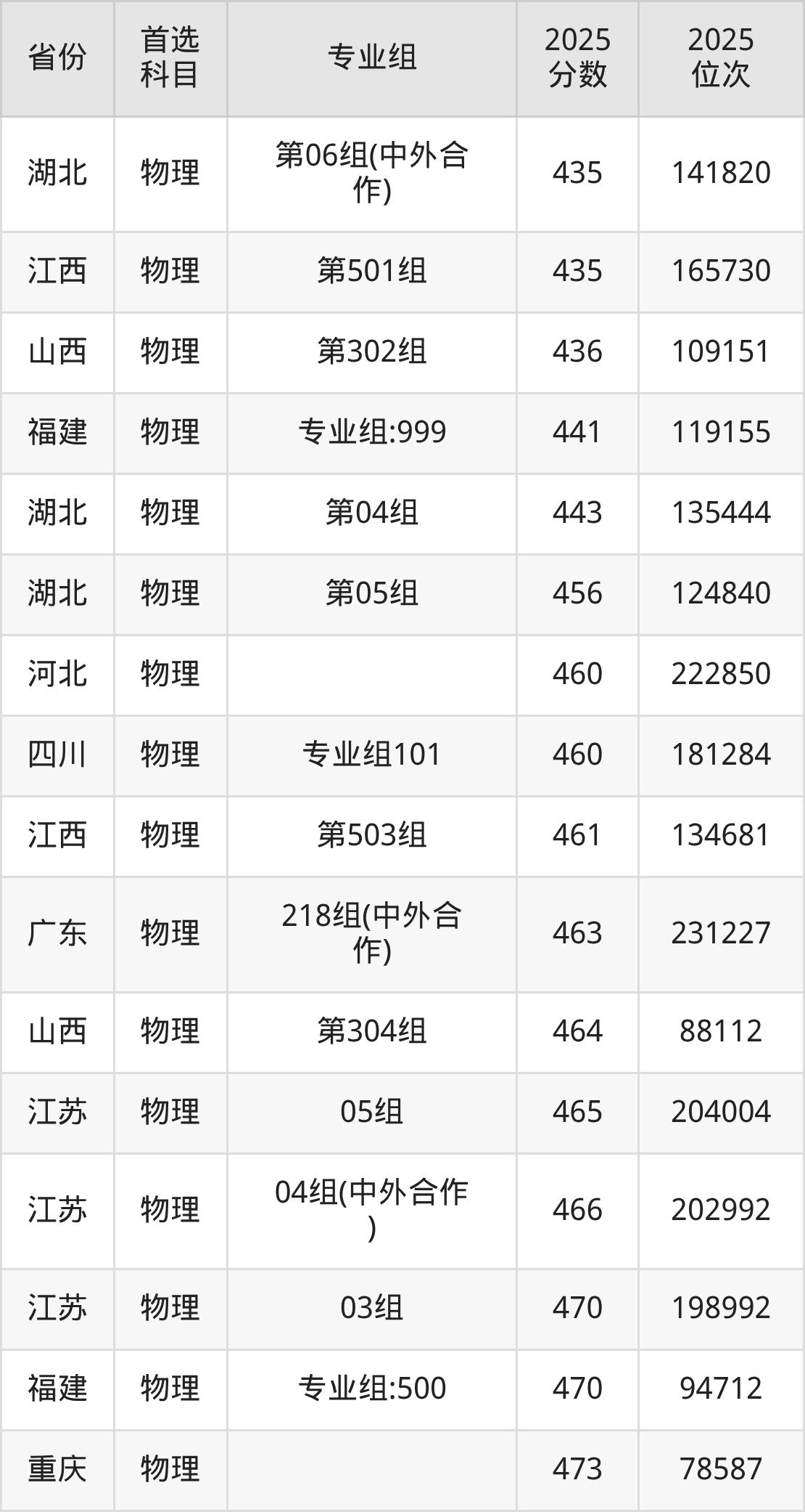 物理类最低分对应地区为吉林(第010组(中外合作)),录取位次为68853,超本科线3分;最高分对应地区为广东(220组),录取位次为187517,超本科线52分。