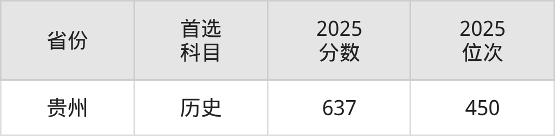 历史类最低分对应地区为贵州,录取位次为450,超本科线179分。