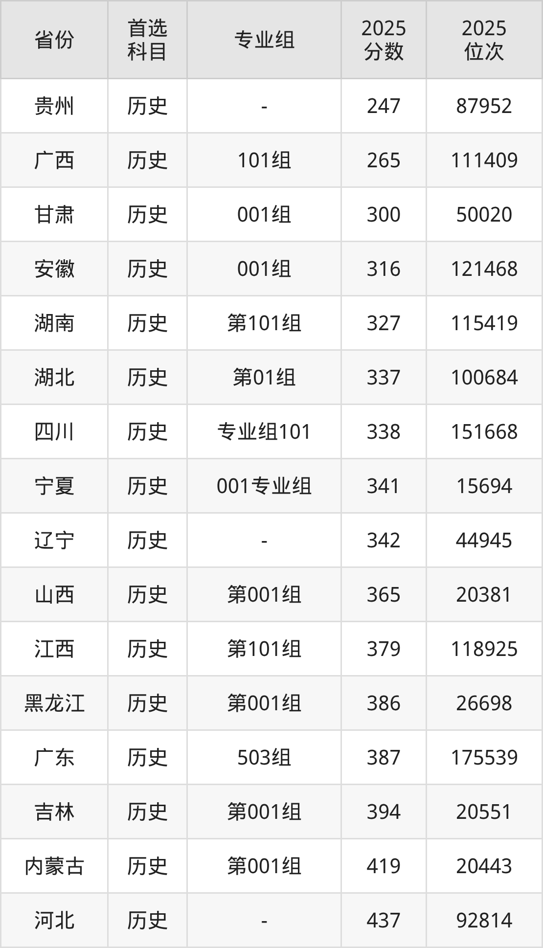 历史类最低分对应地区为贵州,录取位次为87952,超专科线67分;最高分对应地区为河北,录取位次为92814,超专科线237分。