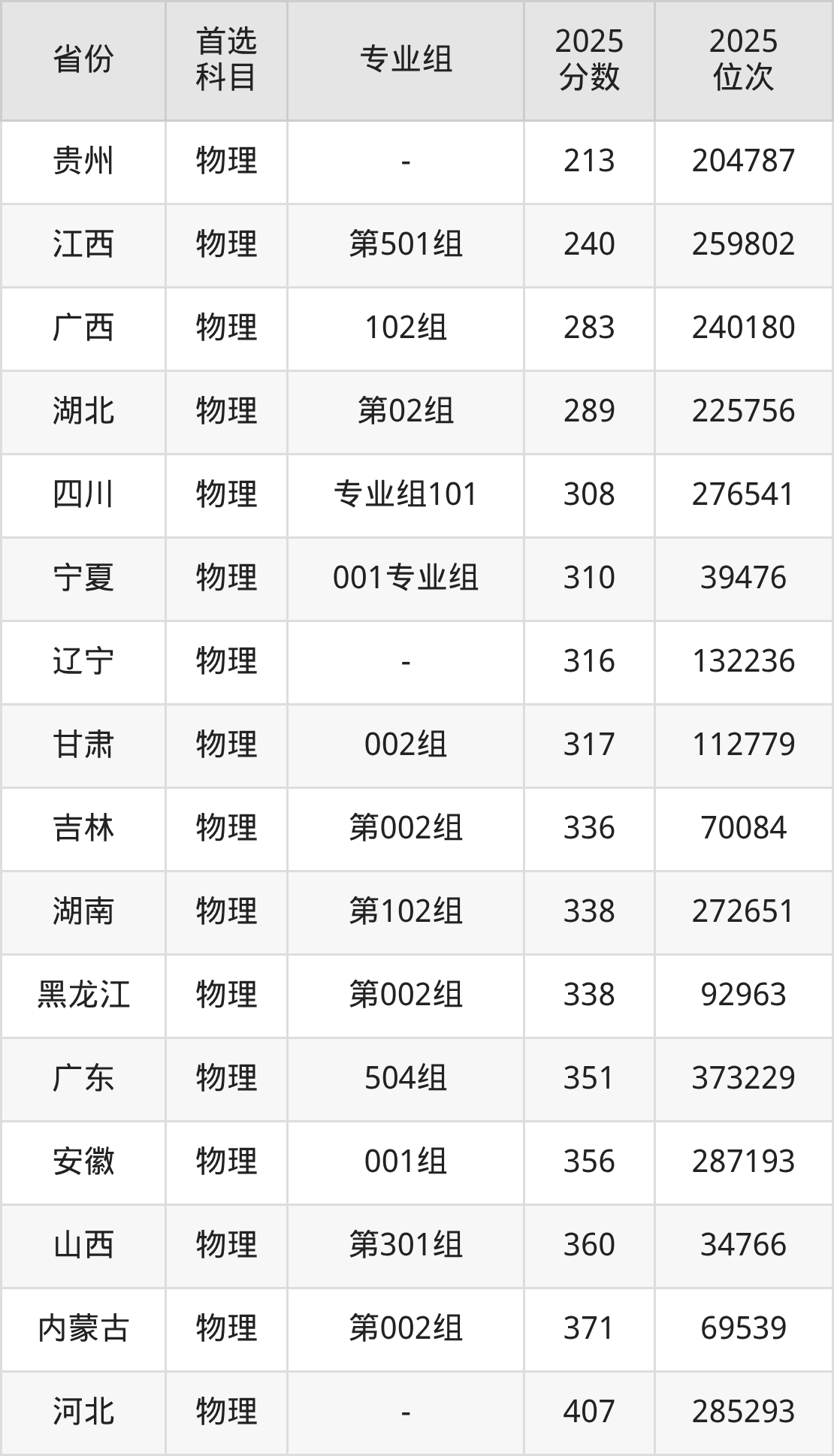 物理类最低分对应地区为贵州,录取位次为204787,超专科线33分;最高分对应地区为河北,录取位次为285293,超专科线207分。
