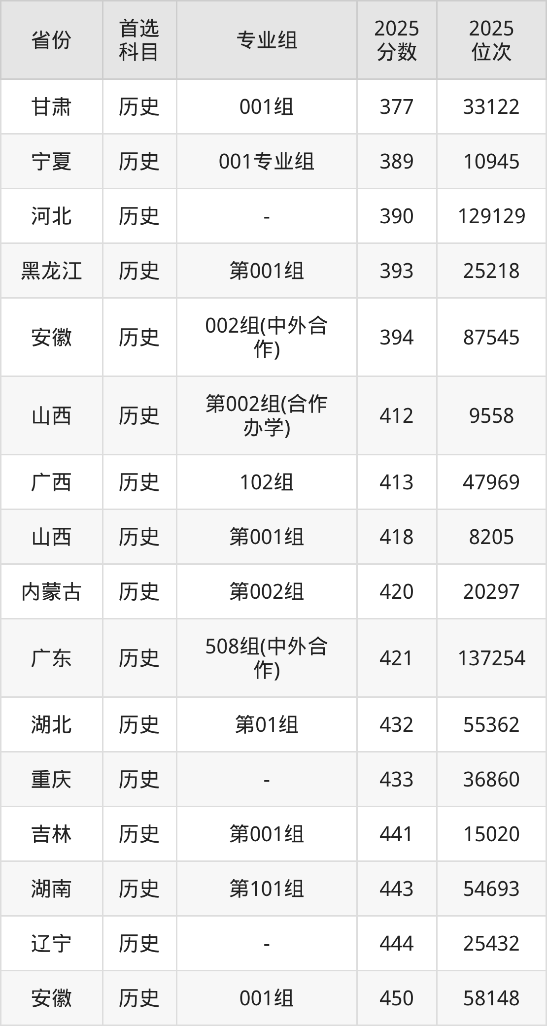 历史类最低分对应地区为甘肃(001组),录取位次为33122,超专科线217分;最高分对应地区为江西(第101组),录取位次为49534,超专科线193分。