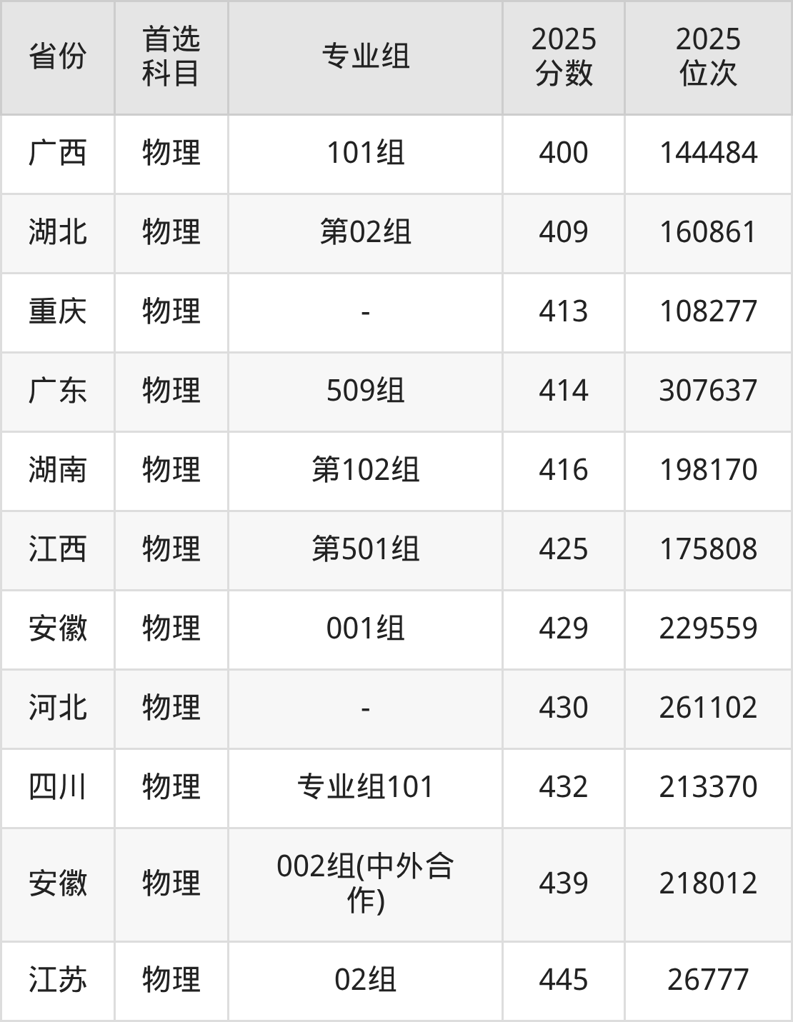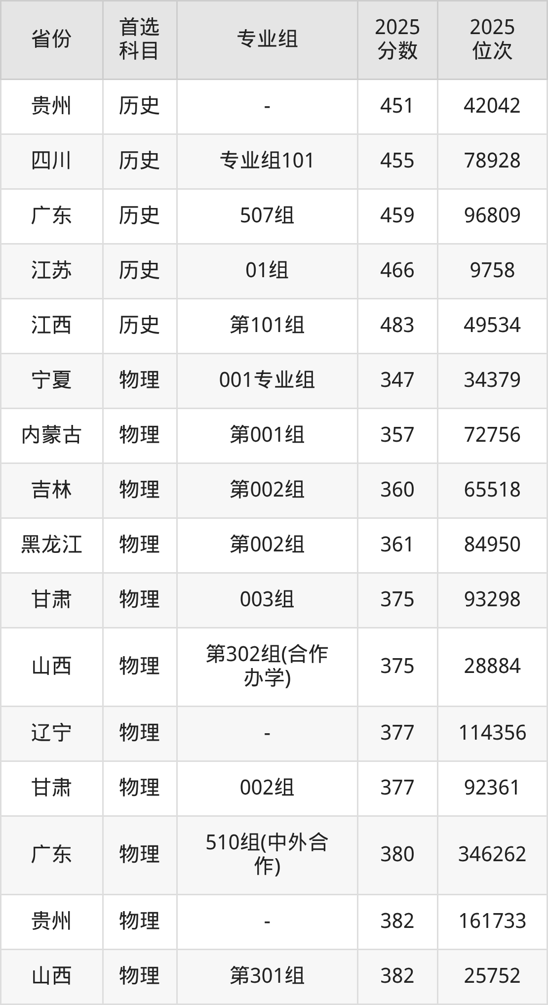 物理类最低分对应地区为宁夏(001专业组),录取位次为34379,超专科线197分;最高分对应地区为江苏(02组),录取位次为26777,超专科线225分。